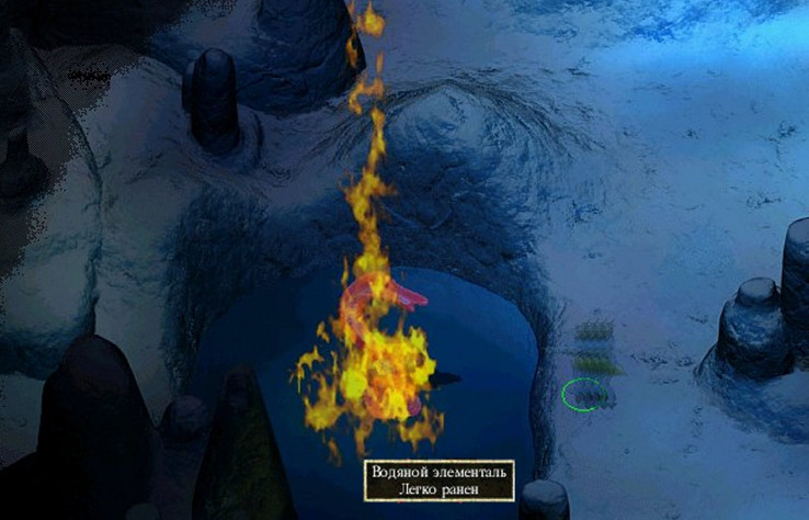 Очередные врата – дракон? Нет, ещё ниже. Новый враг: посреди колодца воды стоит элементаль и бросается магическими снарядами. Булавой не достать, «Огненный Удар» малоэффективен… Хорошо, что я не выбросил и не продал почти бесполезную пращу – пригодилась вот…