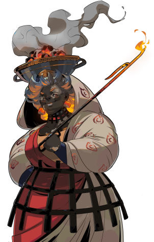- Пламенный венок на голове, символизирующий её божественное начало, подобно другим членам её семьи;