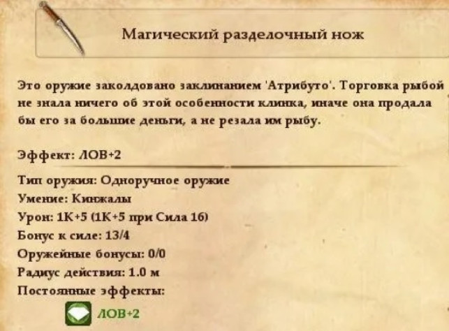 Едва вошли в гильдию, попытался отправить вора назад, на корабль – отказывается, без него мне здесь вообще нельзя находиться. Научился у главы гильдии, Дильги Панек по прозвищу Серебряная Лиса навыкам «карманная кража», «торг», «знание улиц», «обезвреживание ловушек», «уклонение», «взлом замков» и «обольщение». Правда, позднее оказалось, что вполне можно обойтись без «торга», «обезвреживания ловушек» и «обольщения». В качестве практики обчистил карманы Дильги Панек. Ого! Какой-то ключ! Идентифицировал его: +5 к взлому замков, живём! Скорее наверх, избавляться от Кьяно.