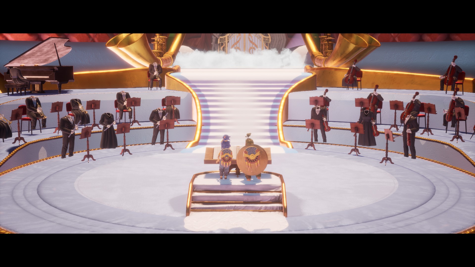 Промежуточный этап любого уровня представляет собой коридорную локацию, где мы с кем-то сражаемся или что-то собираем на пути к своей цели. Чередуется он с различными преградами, где нам нужно решить какую-то загадку или попытаться ровно выполнить какие-то моменты, которые требуют безошибочной работы в паре. В это же время геймплей уровня может трансформироваться в платформер, гонку, стелс и иногда даже в более комплексные мини-игры, как, например, хорошо запомнившийся момент, когда игра “превратилась” в клон Magicka или подмигивала в сторону Plants Vs. Zombies и другой небезызвестной классике.