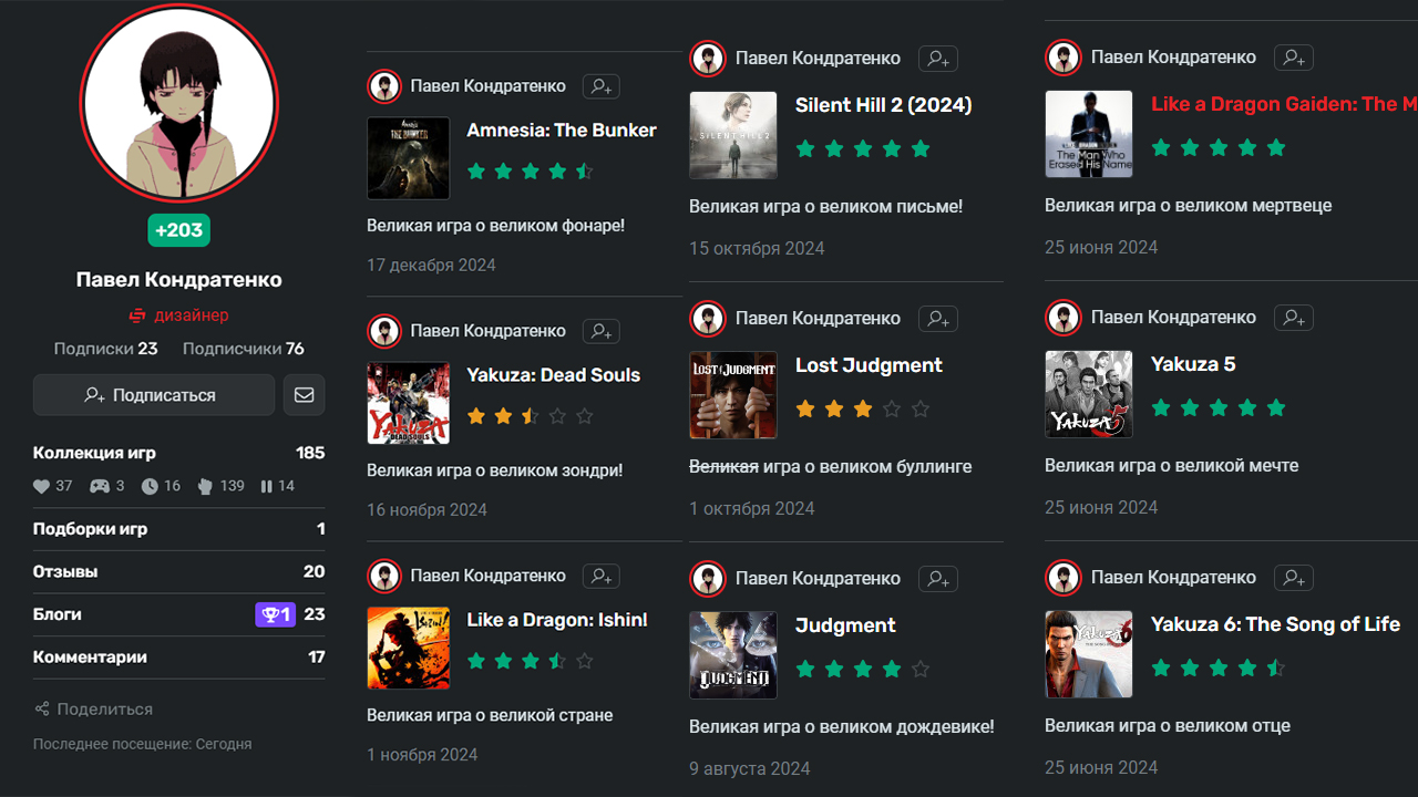 В период с июня по декабрь 2024 года Павел написал 16 отзывов по схеме «Великая игра о великом…». После чего затихает почти на год. И вот сейчас в октябре он публикует отзыв. Однако текст мнения разительно отличается от предыдущих. Отзыв совершенно обычный и не придерживается изначального шаблона, что наводит на очень тревожные мысли.