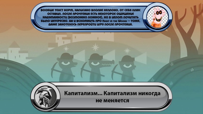 Именно об этом противоречивом явлении, а точнее о его репрезентации в играх, и рассуждает 1GR0k в своём блоге «Проблема изображения капитализма в играх, или что вы могли проглядеть в Night in the Woods».