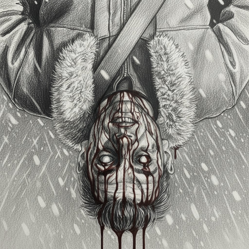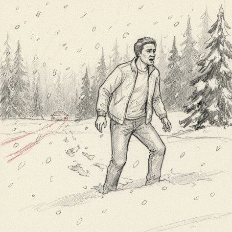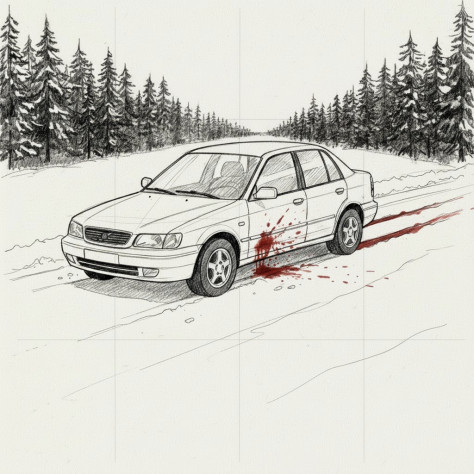 Он всматривается в снежную пелену за лобовым стеклом. Пусто. Бросает взгляд в зеркало. Никого. Только тьма и падающий снег. Брайан выходит из машины. Следы шин ведут к пятнам крови. Тела нет. Только кровавый след, уходящий в темноту.