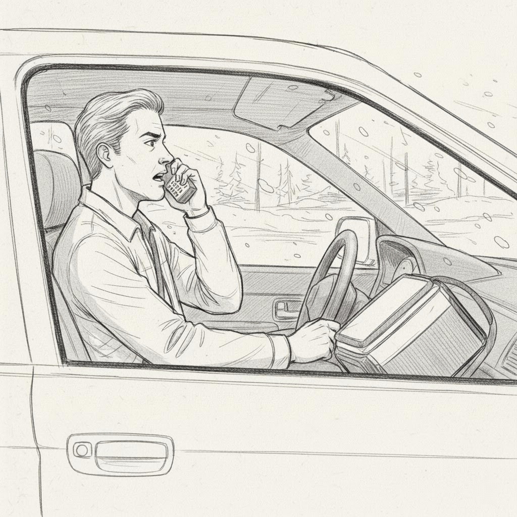 Брайан пытается восстановить соединение, переключая телефон в режим полета и обратно, но ничего не получается. Как вдруг на дороге возникает темный силуэт. Женщина! Слишком поздно! Он резко бьет по тормозам, но машина скользит как по льду! Раздается глухой удар. Тело отбрасывает в ночь.