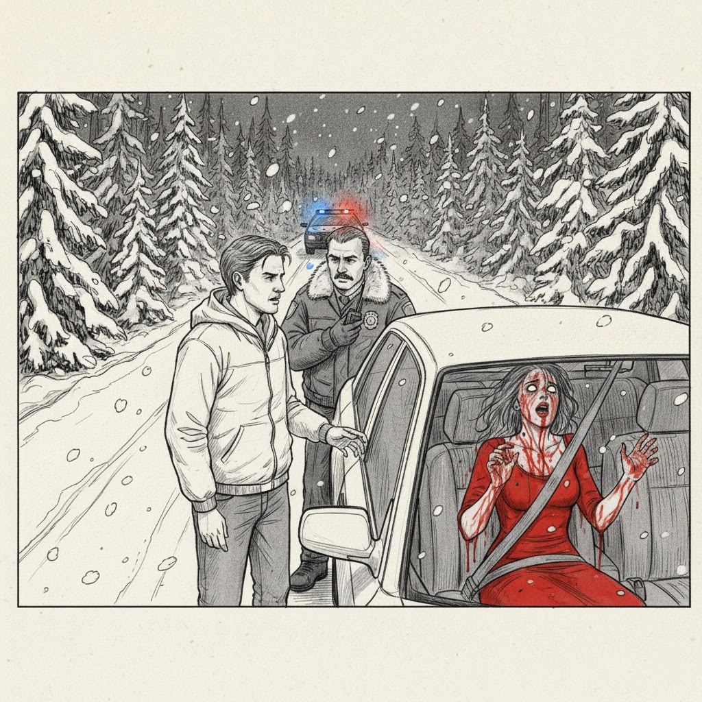 Он наклоняется ближе, полностью сосредоточившись, как вдруг… ВНЕЗАПНЫЙ КРИК! ОКРОВАВЛЕННАЯ ЖЕНЩИНА ПЕШЕХОД БЬЕТСЯ В СТЕКЛО МАШИНЫ!