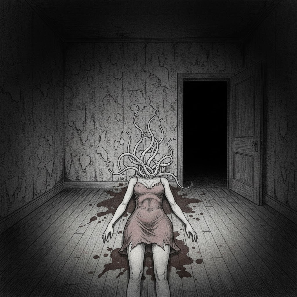 Монстр в красном платье все ближе. Брайан стреляет в нее из MP5, но пули просто исчезают в теле. Он бросает в нее оружие, но промахивается. Щупальце вонзается в стену рядом с его головой. В центре существа раскрывается пасть, готовая поглотить его. И тогда его осеняет безумная идея. Он поворачивается к двери и криком провоцирует зомби. Они еще яростнее бьются в дверь. Брайан достает пистолет. В нем один патрон. Он целится не в монстра, а в швабру, запирающую дверь.