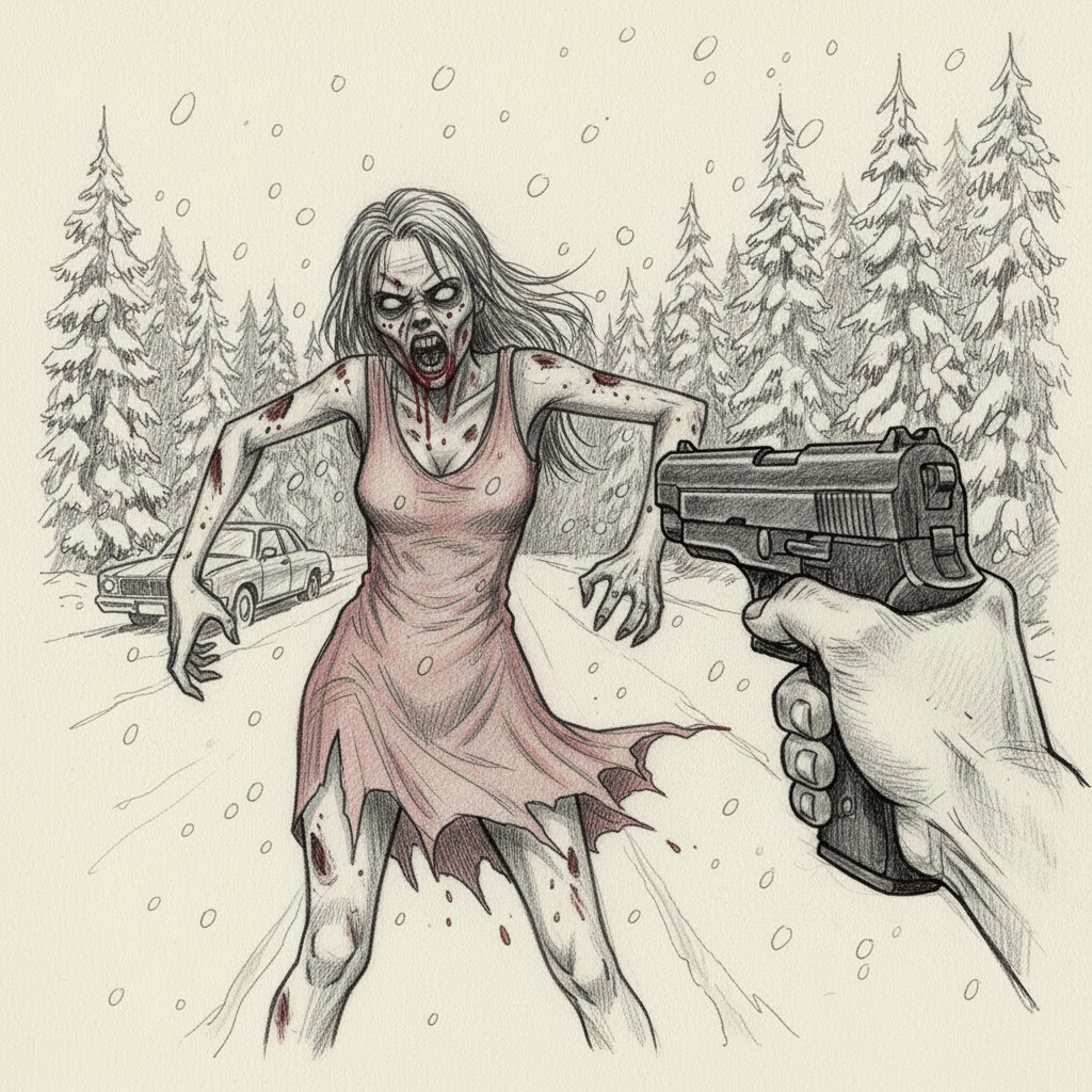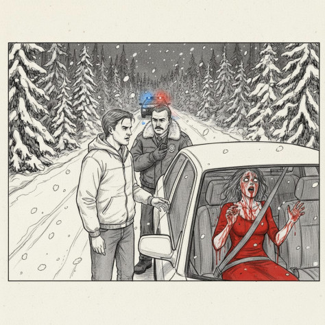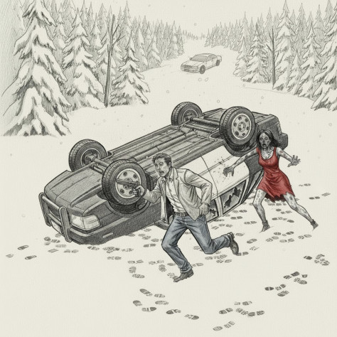 Он идет по следам, зовет женщину, надеясь услышать ответ. Тишина. Ноги все глубже утопают в снегу и наконец он находит ее, лежащей в сугробе. Женщина в тонком красном платье, вся в крови. Ее тело бьется в конвульсиях, зубы скрежещут. ОН ДЕЙСТВИТЕЛЬНО СБИЛ ЕЕ. Брайан пытается помочь, поднимает и тащит к машине, не замечая, как она ПОЧТИ кусает его. Он перекладывает сумку-холодильник на заднее сиденье и усаживает окровавленную пассажирку на освободившееся место.