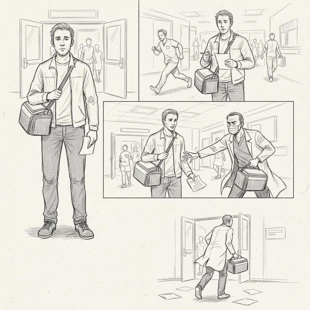 В больницу заходит курьер. Мужчина лет тридцати в повседневной одежде, с сумкой-холодильником на плече. Его зовут Брайан. В вестибюле он получает разрешение и проходит в травматологическое отделение. Персонал его игнорирует, спеша по своим делам, пока не подходит раздраженный доктор, который выхватывает сумку-холодильник и уходит, не дав Брайану что-либо сказать. Все необходимые документы остались неподписанными.
