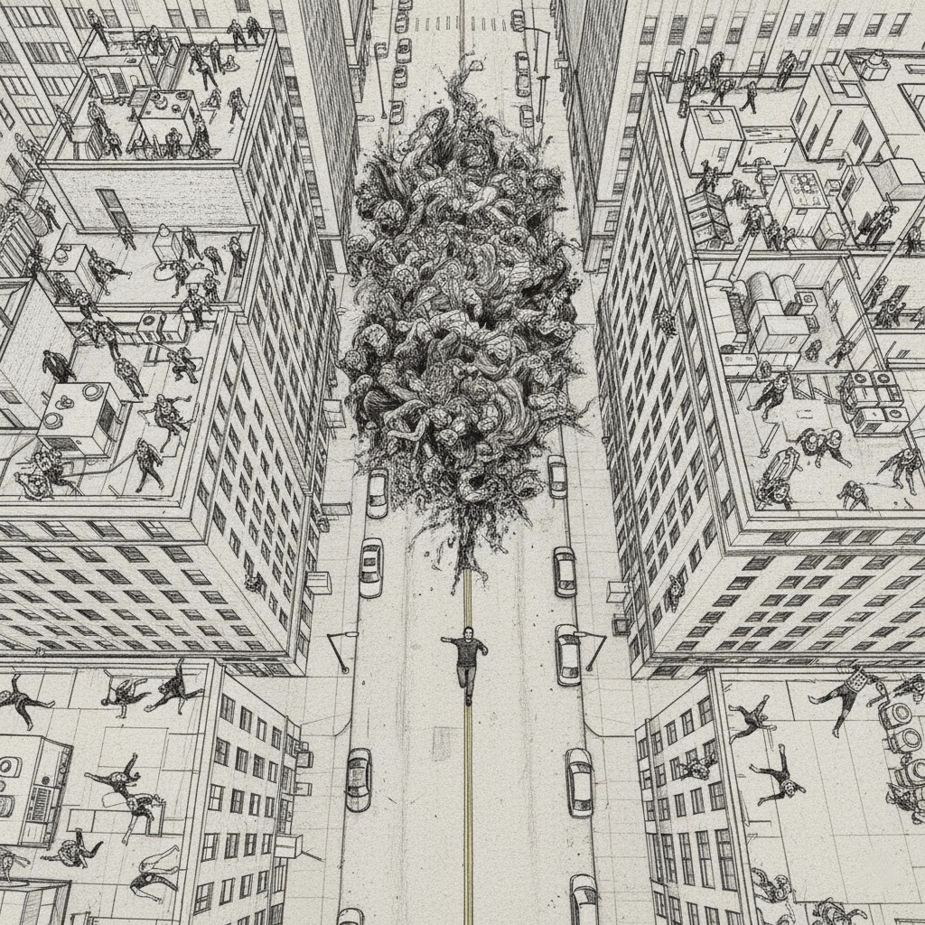 Брайан, ошеломленный, переступает через образовавшееся месиво и бежит дальше. Больница совсем рядом. Затем он поднимает глаза и видит, что крыши зданий по обеим сторонам улицы забиты зараженными. Они начинают оглушительный, жуткий хор.