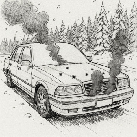 Он поворачивает ключ в зажигании. Двигатель хрипит, но ничего не происходит. Очередная попытка ни к чему не приводит. Из-под капота валит белый дым.