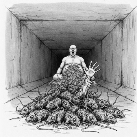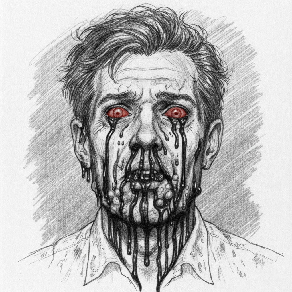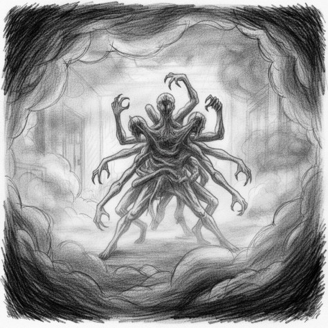 И тут он видит нечто ужасное. Коконы на потолке лопнули. Из них медленно спускаются массивные человекоподобные фигуры. Их глаза, затянутые пленкой, открываются и смотрят прямо на него.