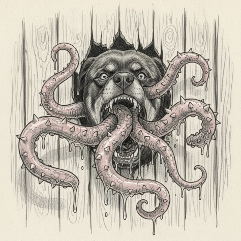 Тишина. Лай прекратился. Он оглядывает амбар и замечает ее. Дыру в стене. Он знает, что будет дальше. Мы знаем, что будет дальше. Собака знает, что будет дальше. Пес резко возникает и пытается протиснуться в отверстие. Но голова застряла и дальше без вариантов. Пасть зверя исходит пеной.