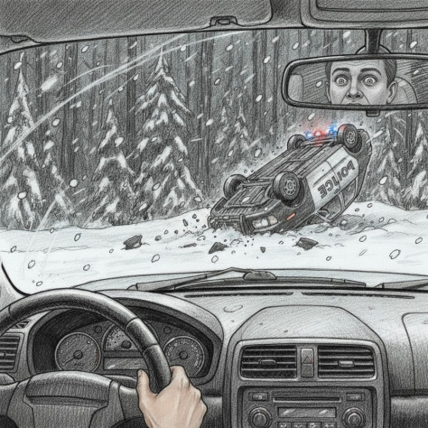 Видимость почти нулевая. Брайан ругает полицейского почем зря, с трудом удерживая в поле зрения его фары. Ничего не видно. Как ехать в такую погоду? Внезапно огни патрульной машины резко сворачивают с дороги, переворачиваются и замирают в снегу вверх дном.