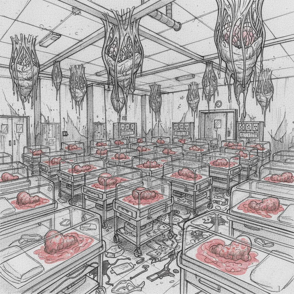 Брайан входит в отделение и замирает перед жуткой картиной. Стены залиты кровью. Помещение заполнено кроватками-инкубаторами, в каждом из которых пульсирует розовый сгусток. К потолку и стенам прилипли огромные коконы. Сдерживая тошноту, он начинает осторожно пробираться к выходу. Чтобы не задеть инкубаторы, он поднимает швабру и аккуратно толкает кроватку перед собой в сторону.