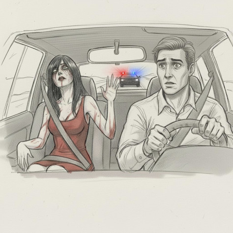 Пока он осторожно ведет машину, женщина дрожащей рукой тянется к нему. Брайан отмахивается, пытаясь сосредоточиться на дороге. Внезапно в зеркале заднего вида появляются огни и звучит сирена. Полицейский требует прижаться к обочине.