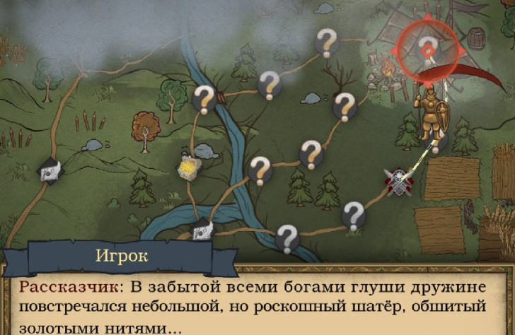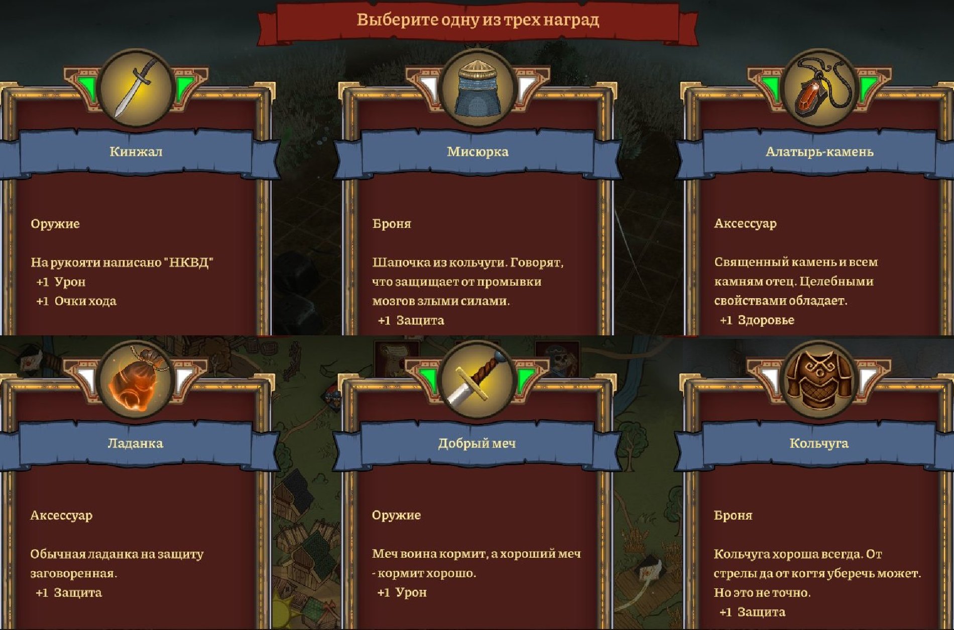«Сокровище» делает доступным простой предмет экипировки. «Событие» предлагает вашему вниманию случайную встречу с вариантом выбора действий; в зависимости от него отряд получит славу (или будет её лишён!), золото, опыт или какую-то черту одному из героев.