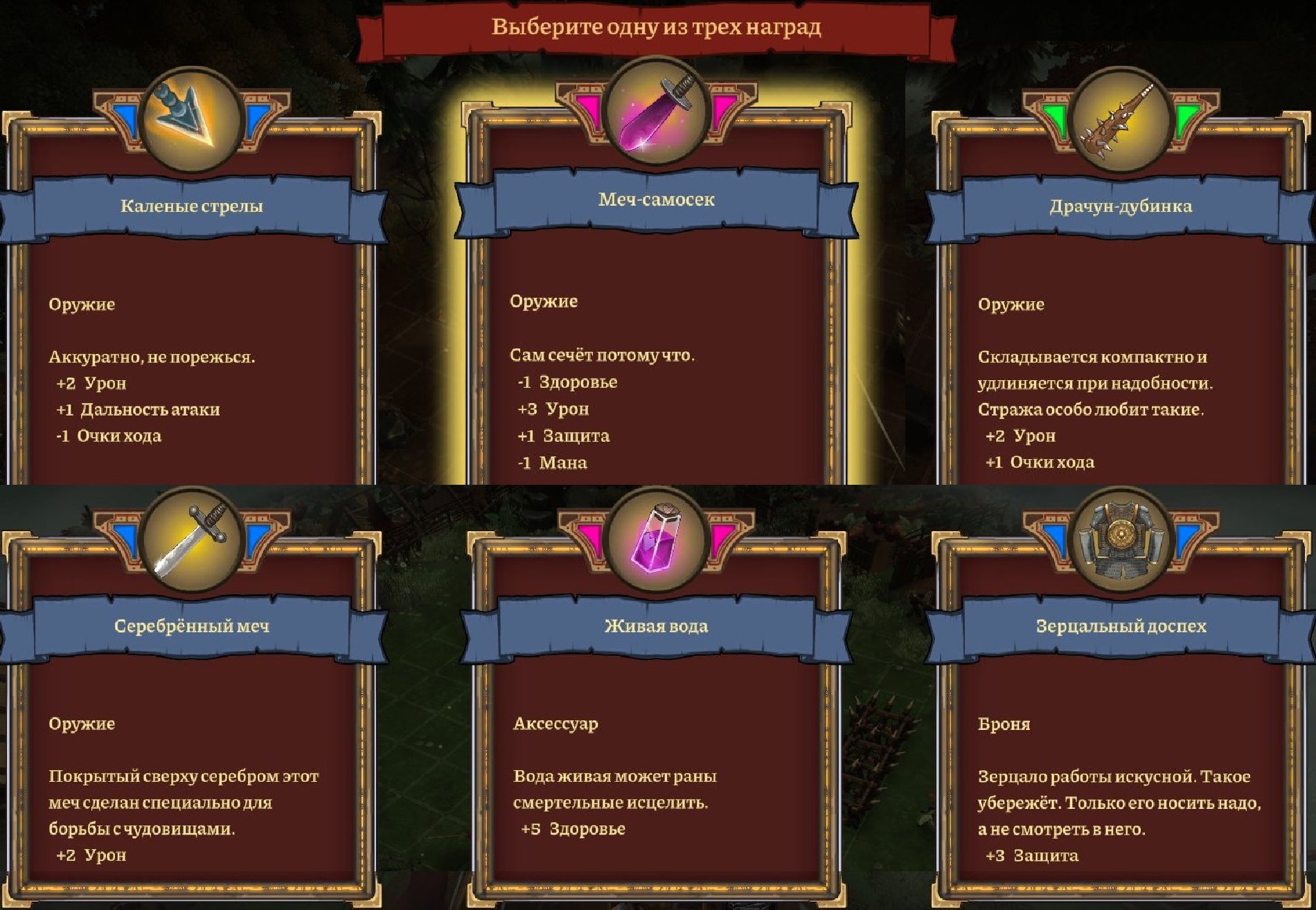 За выигранные простые бои полагаются либо простейшие предметы экипировки, либо магический свиток, либо доброволец – всё на выбор.