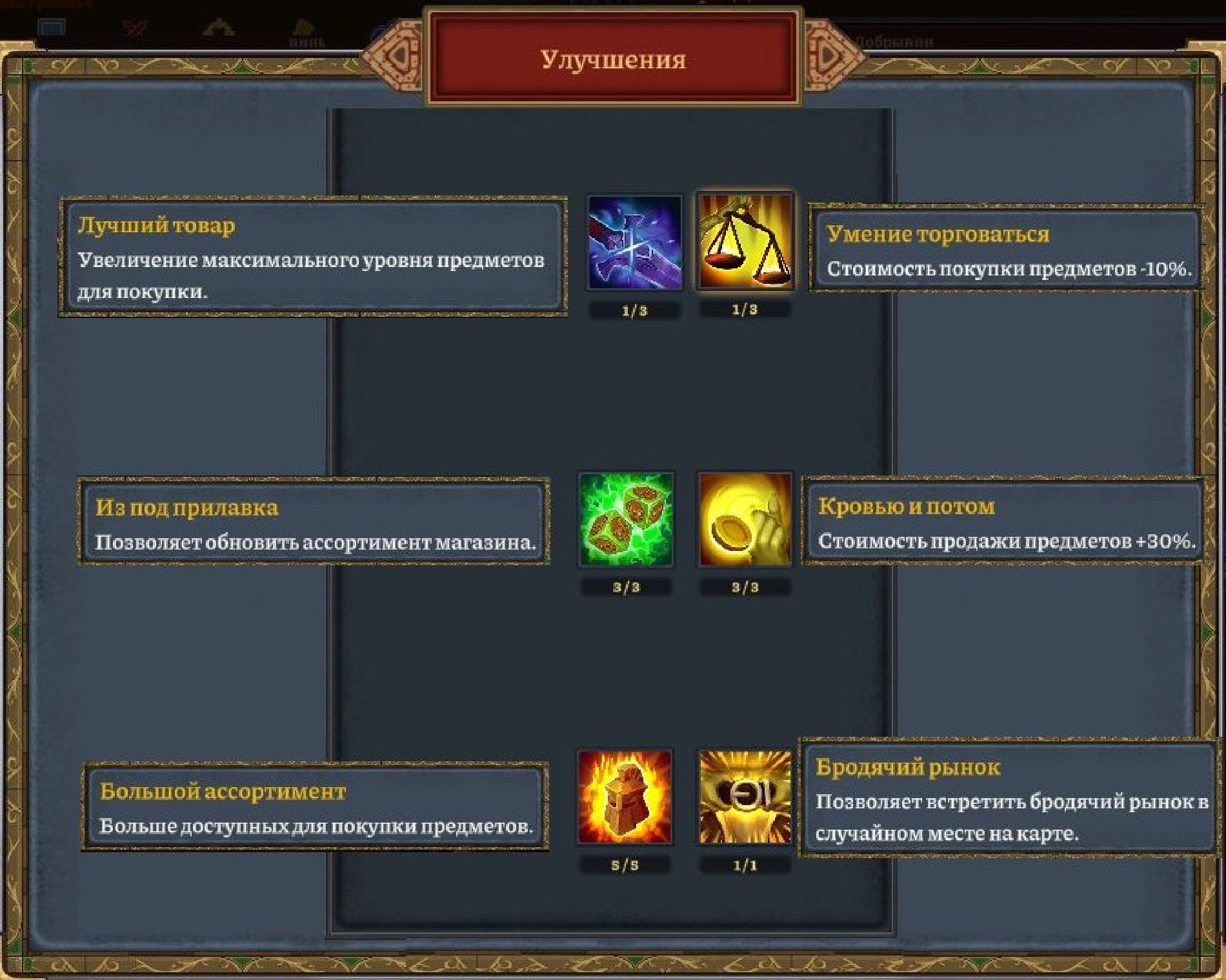 Улучшая рынок, в первую очередь возьмите «Бродячий рынок». Если повезёт, он попадётся на пути к специальным заданиям (на каждой большой карте таких заданий два); получив сообщение о шатре, немедленно снимайте с бойцов снаряжение и складывайте туда же все свитки с заклинаниями: бродячие торговцы продают усиленные магические свитки и лучшие предметы снаряжения.