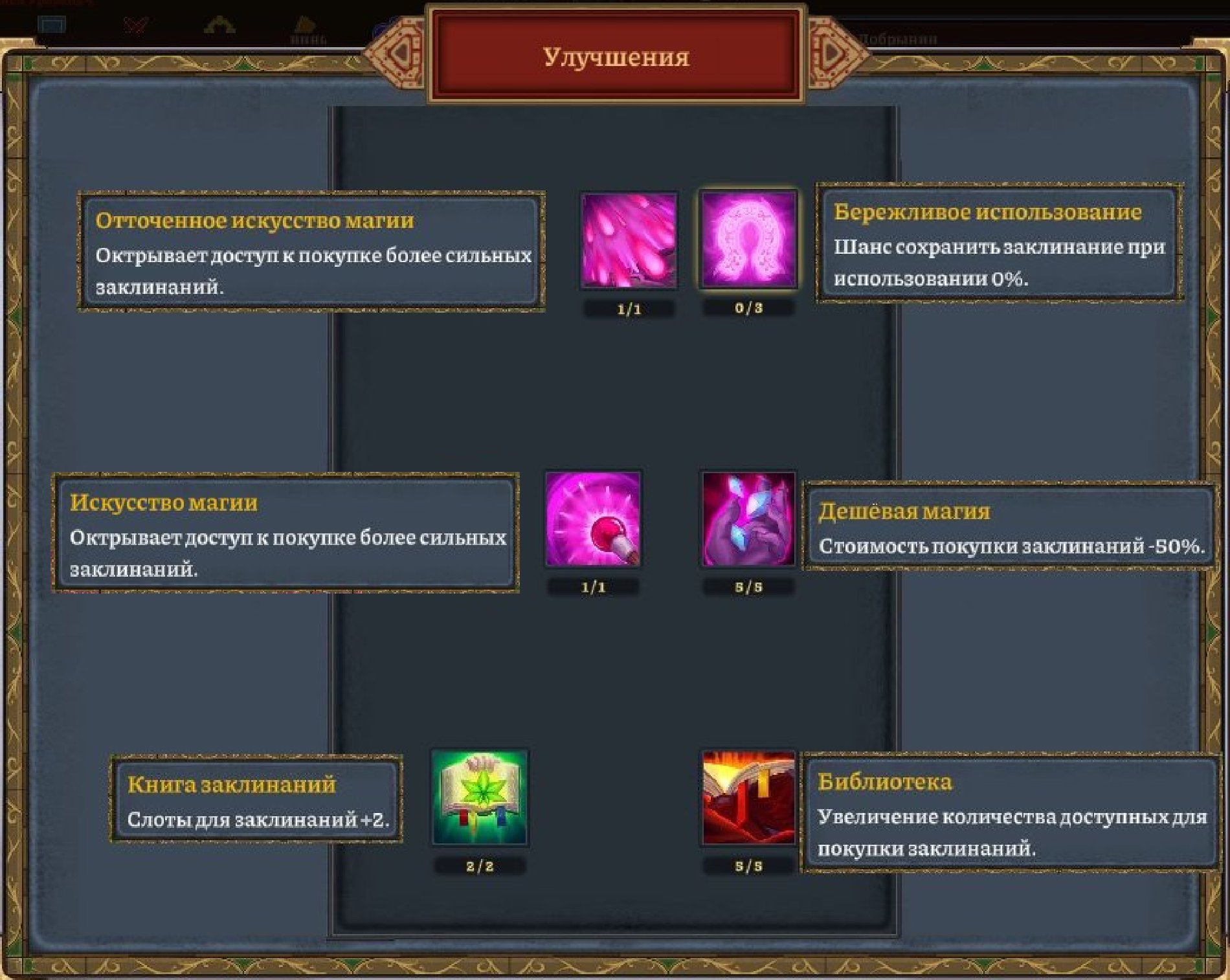 Не забудьте посетить рынок (улучшение «Повышенное финансирование» во дворце увеличит количество стартового золота) чтобы приобрести заклинания и экипировку.