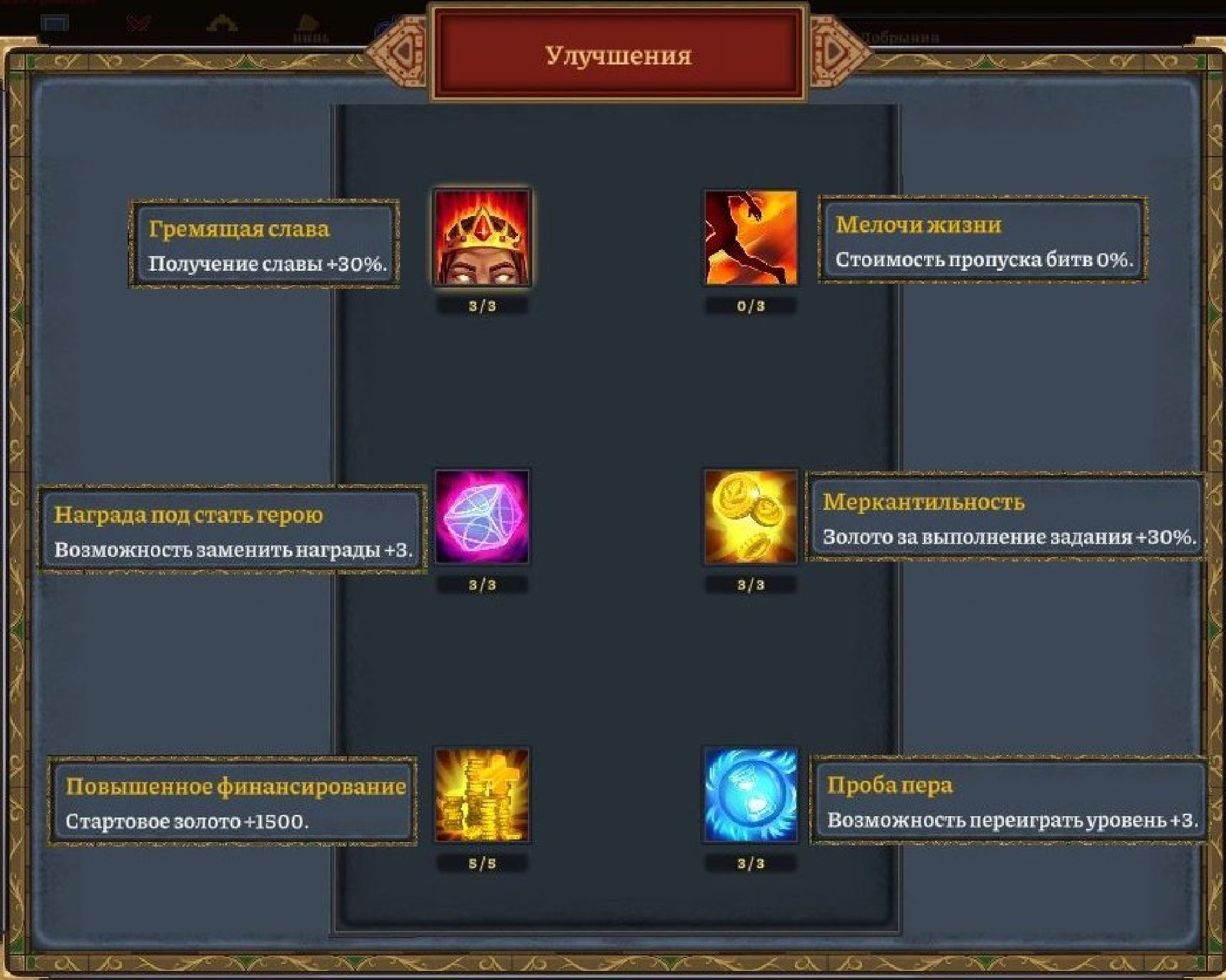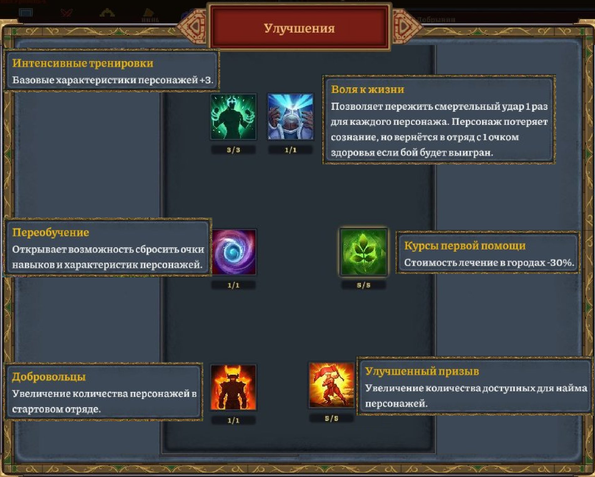 Помимо черт выбираемых героев необходимо обращать внимание на способности: улучшить все из них пока что невозможно, стоит поторопиться и взять в казармах улучшение «Переобучение», которое позволит поменять способность за золото.