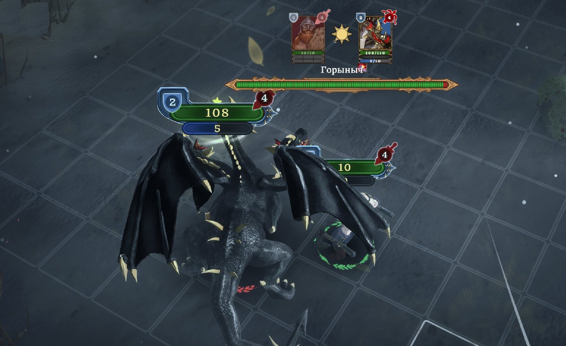 Второй босс, Горыныч, имеет три головы, каждая из которых атакует в ближнем бою. Плюс он умеет отталкивать всех противников, нанося при этом урон; так что вступать с ним в ближний бой можно, лишь когда он под действием «Оглушения». И да: для уничтожения его брони нужно три свитка «Раскола» с мощностью в шесть единиц.