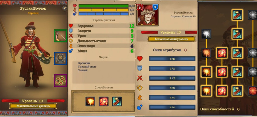 Максимальной уровень развития отряда в альфа-версии – десятый, стоит внимательно подходить к выбору способностей и повышению атрибутов. (Единственный, кого удаётся развить до предела – стрелец. Во всяком случае, из героев, наносящих прямой урон.)