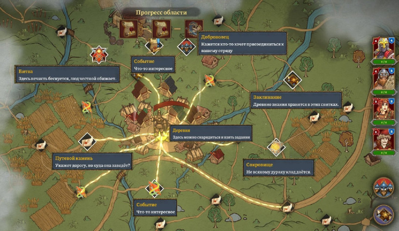 В центре карты находится «Деревня», здесь отряд лечится, закупает снаряжение и знакомится с объявлениями. «Путевые камни» - самые безобидные, они дают немного опыта. «Доброволец» позволяет принять в резерв одного из трёх кандидатов по вашему выбору. (Вдруг во время очередного сражения кто-то из отряда погибнет окончательной смертью? На его место заступит доброволец!) «Заклинание» - взять одно из трёх заклинаний.