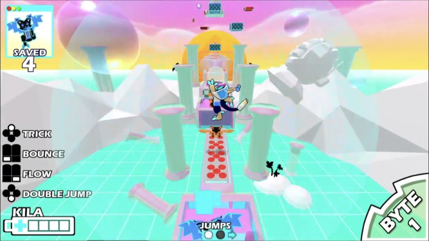 Разработчики настолько злодеи, что они даже лимитировали использование чекпоинтов. Добрались точки сохранения — хорошо. Можете начинать с неё ровно столько раз, сколько «жизни» осталось у Килы в батарейках. Каждый пропущенный «кусь» и каждое падение на дно винды откусывает четверть заряда, и если няка крэшнется, придётся весь уровень начинать заново. Благо сами этапы небольшие, и возвращение к чекпоинту займёт считанные секунды.
