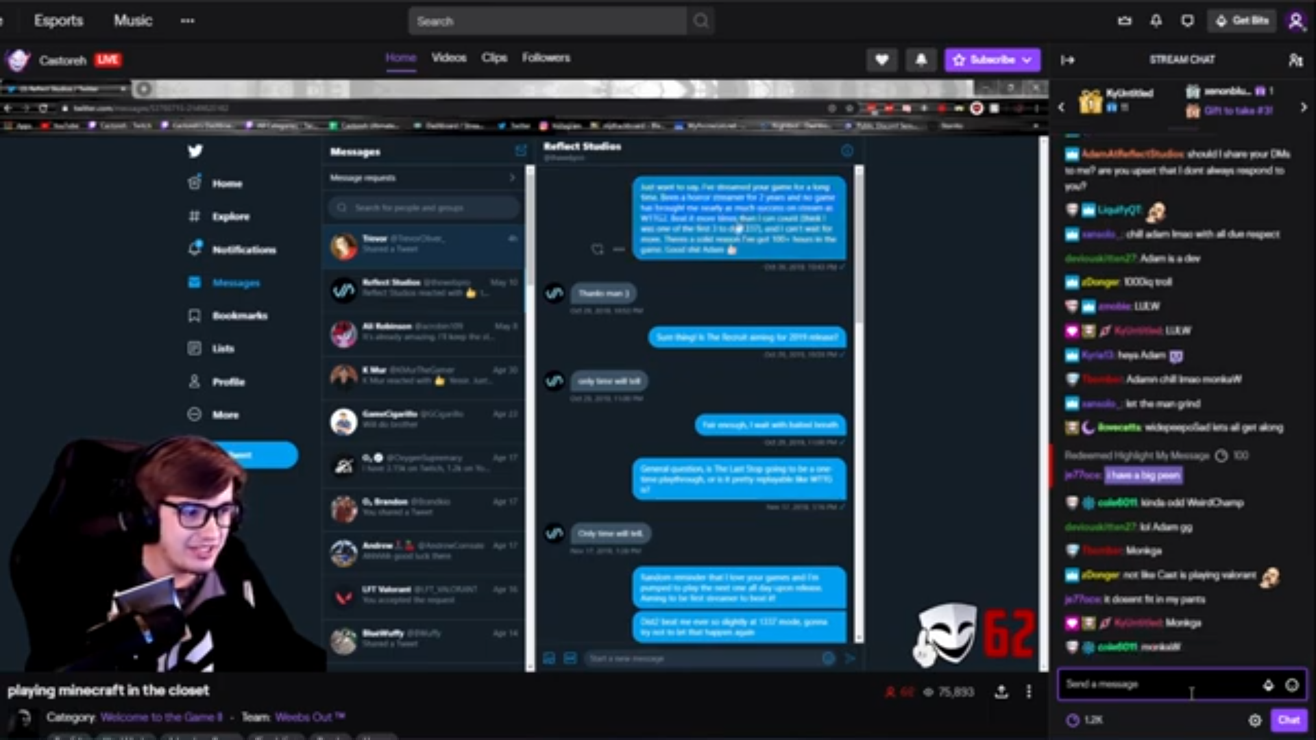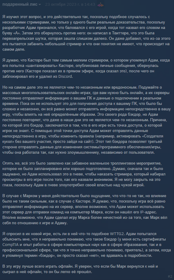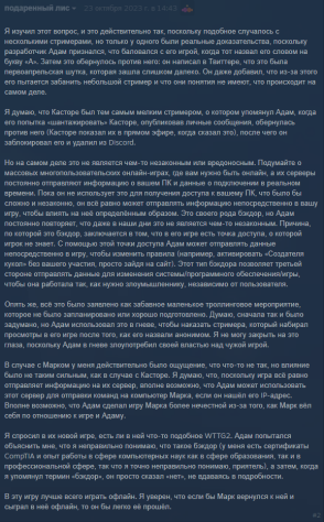 Спустя два часа разработчик вернулся. Признался, что никакого автоскрипта нет. Он лично в режиме реального времени поменял логику игры. Признался, что его задели слова Касторы. Пригрозил слить их личную переписку, однако стример сам показал ее всем на трансляции.