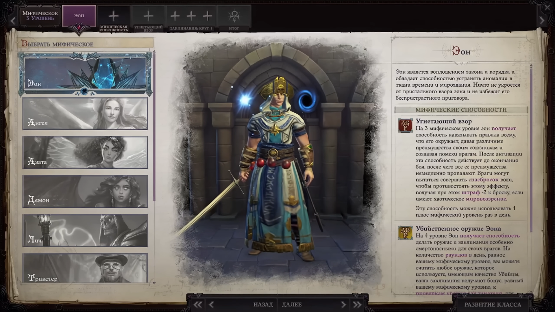 К тому же не будем забывать, что всё вышеперечисленное иногда дополняется системой выборов и связанной с ней нелинейностью сюжета. Некоторые игры позволяют тебе самому решать, в каком направлении двинется повествование, какого рода героем ты станешь, каким способом разрулишь неоднозначную ситуацию и так далее. К примеру, в плане вариативности меня приятно удивила Pathfinder: Wrath of the Righteous. В ней ты можешь стать добренькой и немножко хаотичной азатой, шкодливым трикстером, могущественным личом, эоном, способным буквально изменить течение времени — и это ещё далеко не весь список доступных так называемых мифических путей. Притом, что самое главное, у каждого из них есть собственная сюжетная линия, а мир по-своему реагирует на избранный тип протагониста, в том числе трансформируя модульные концовки.