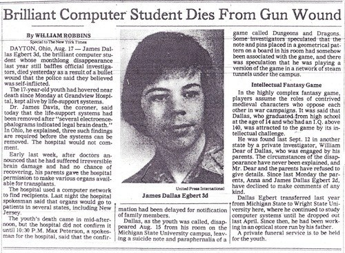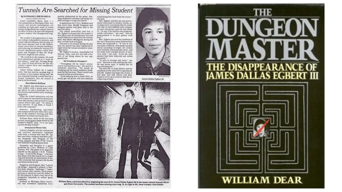 Одним из самых громких скандалов, связанных с игрой стало исчезновение в 1979 году студента Джеймса Эгберта. 16 летний студент Мичиганского университета бесследно пропадает, а обеспокоенные родители нанимают на его поиски частного детектива Уильяма Дира. И вот наш «Анискин» приходит к выводу, что в пропаже студентика виновата «Dungeons & Dragons». Просто изучая комнату подростка детектив нашел настольную игру про подземелья, а еще карту подземных коммуникаций университета, ну и как-то все это у него сложилось в стройную теорию, что любитель фэнтези ушел в подземелье искать своих драконов. А СМИ активно подхватила эту идею.