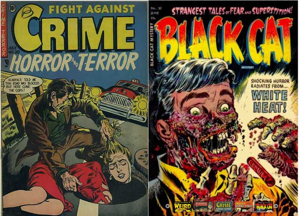 О да, я люблю комиксы и не могу не затронуть их здесь, поскольку комиксы в глазах людей были одним из столпов тлетворного влияния на неокрепшие умы. В начале ХХ века комиксы были частью газет, после чего стали публиковаться как самостоятельные сборники рисованных историй, в конце 30-х годов стали набирать популярность супергеройские комиксы, появились Супермен и Бэтмен. Но помимо этого в моду вошли и «бульварные» комиксы, или как их еще называю «палп». Различные истории про ковбоев, мафию, детективов, мистику и ужасы.