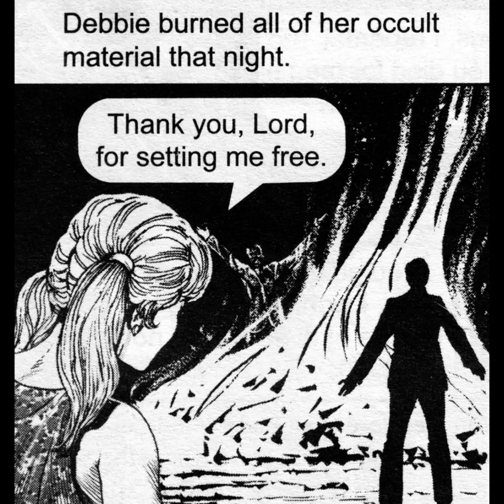 А еще представители различных религий обвиняли настольные игры в богопротивности. (Ну по крайней мере «DnD» точно). Так, один член баптистской церкви Джек Чик в 1984 году выпускает комикс (хотя раньше и их обвиняли во всем плохом), под названием «Dark Dungeons» (вот вообще не парился с названием). Если кратко про сюжет, то молодые люди играют в настолку, после чего у одной героини убивают ее персонажа, и она решает покончить с собой. А вот персонаж второй героини получает новый уровень и ее обучают колдовству в реальной жизни, она порабощает сознание отца, чтобы получить с него пару сотен на новые книги и миниатюры, но после обращается к церкви и ищет спасение своей душонке. А в конце книги по «DD» сжигают на костре. Happy end. Хотя возможно Джек Чик хотел на костре видеть Гарри Гэйгакса, который игру и придумал. Так сказать, повторить практику предшественников из средних веков.