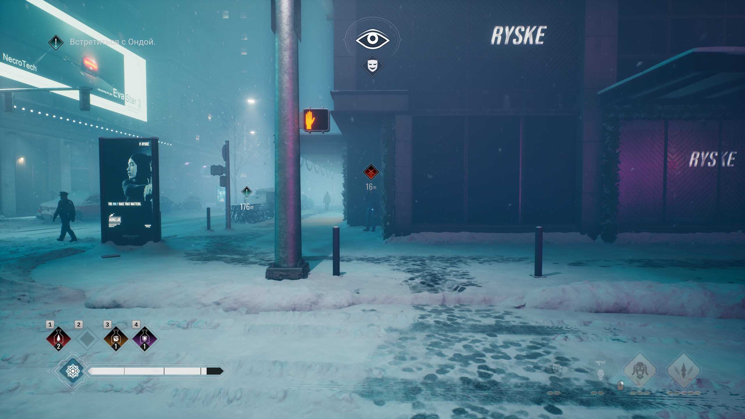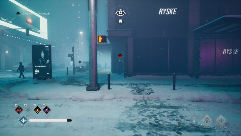Пара слов о "Маскараде" - потому что больше о нем здесь сказать, увы, не получится. По факту все сводится к тому, что вы не можете ни на кого нападать или кого-то "есть" на глазах у других людей - в первую очередь полицейских. Использовать вампирские способности - тоже. От всего этого начинает заполняться шкала "Маскарада", после заполнения которой вы погибнете.