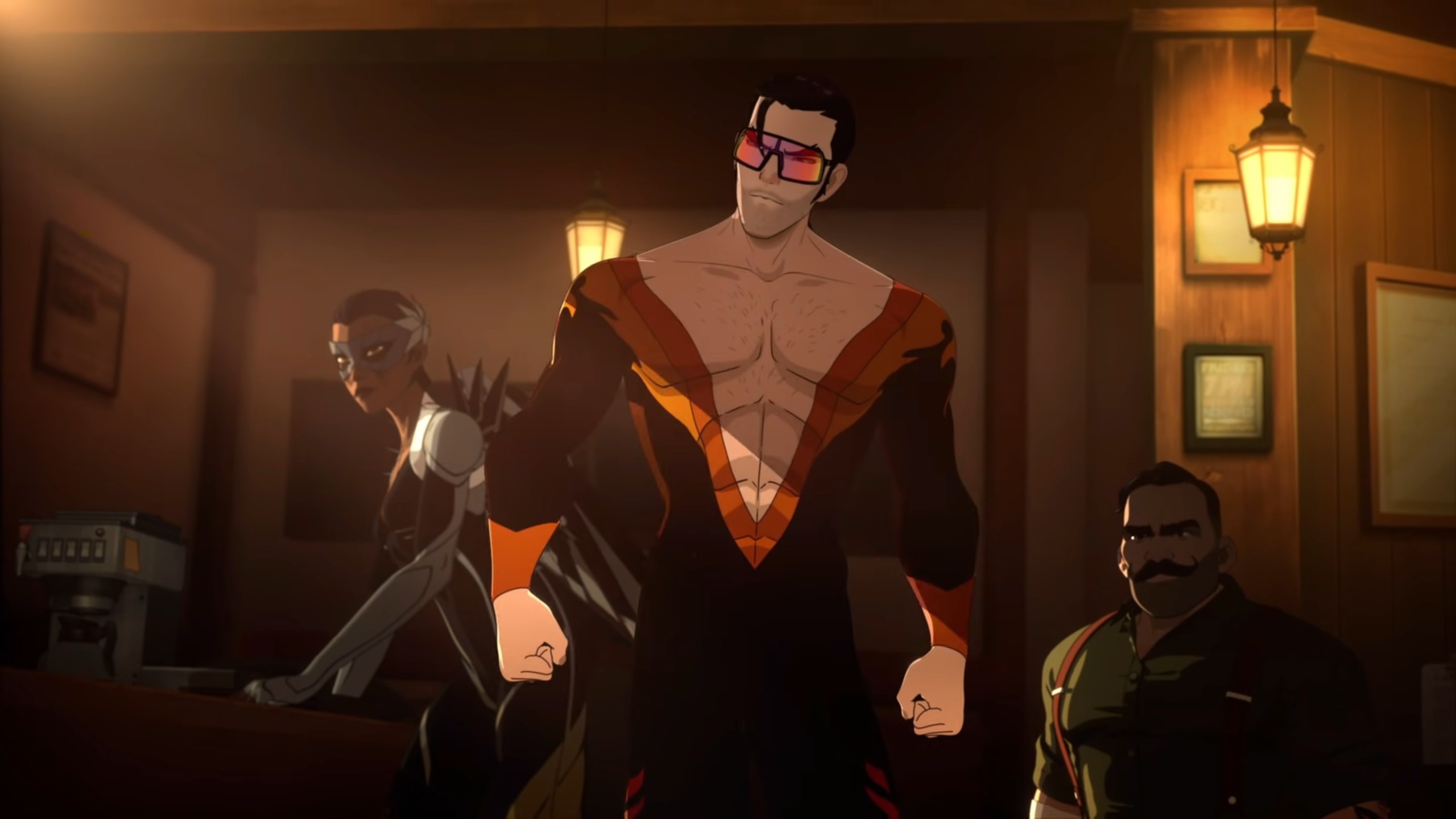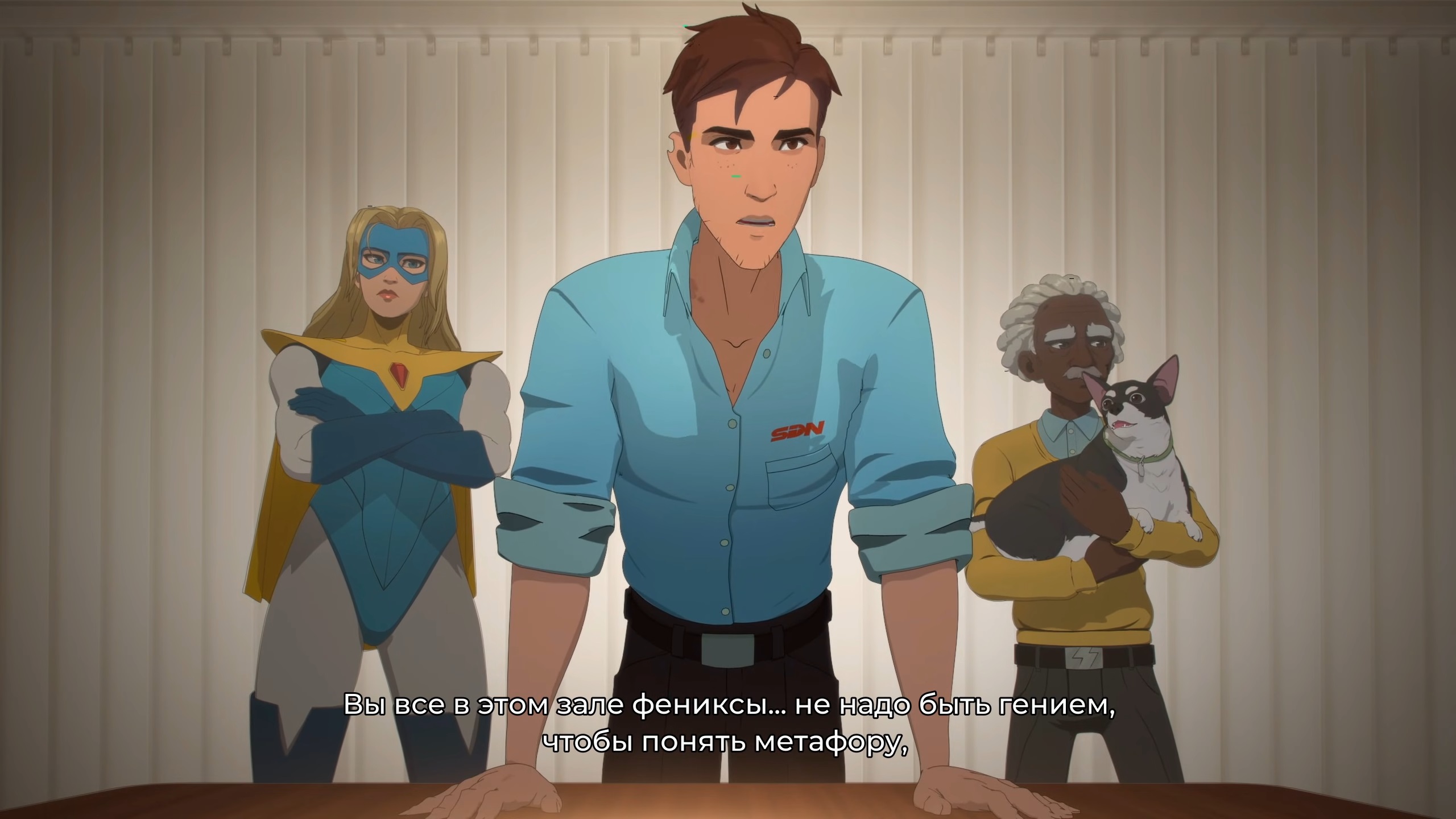 Ну и конечно же каст. Аарон Пол как говорилось выше шикарен, великолепно передающий голос героя на грани выгорания, но сохранившего упрямую искру того, что все будет хорошо. Лора Бэйли, Алана Пирс, Эрин Ивет и остальные тоже отлично передают настроение своих героев, сразу же обеспечивая понимание кто тут есть, кто. Чувствовалось что все живут своими героями и ощущения фальши не возникало, особенно у звездной тройки Роберт-Блонди-Невидива. Порадовало и внимание к деталям, например, Шон Маклафлин (Громила) использовал дублинский акцент, чтобы создать правдоподобный образ недалекого карлика-драчуна, а ютубер MoistCr1TiKaL со своим монотонным голосом идеально вписался в роль супергероя не от мира сего. Словом, тут все на высшем уровне.