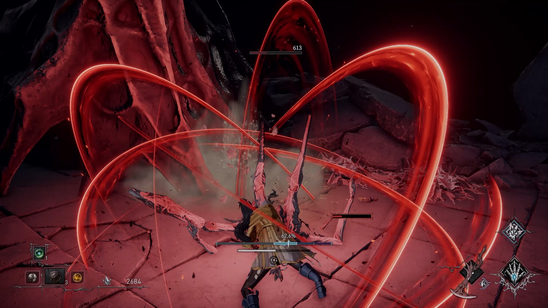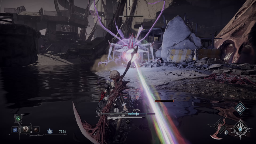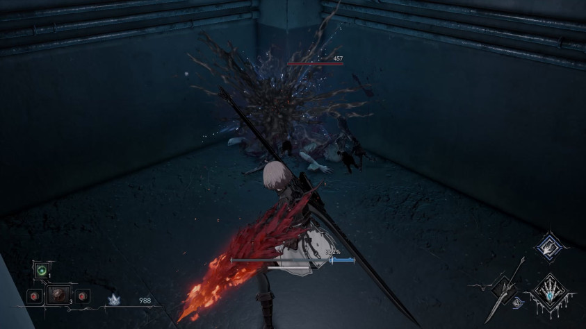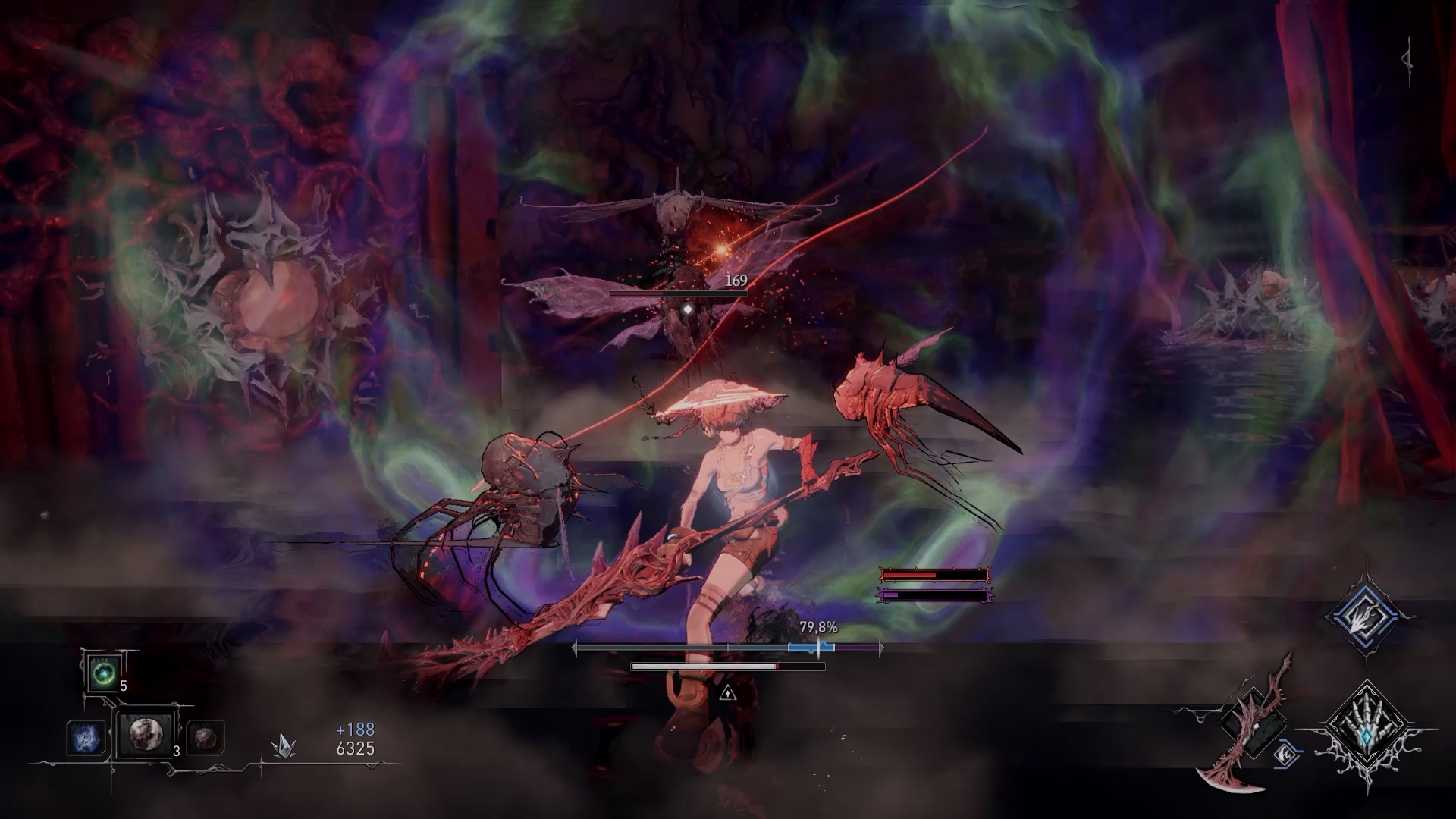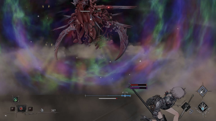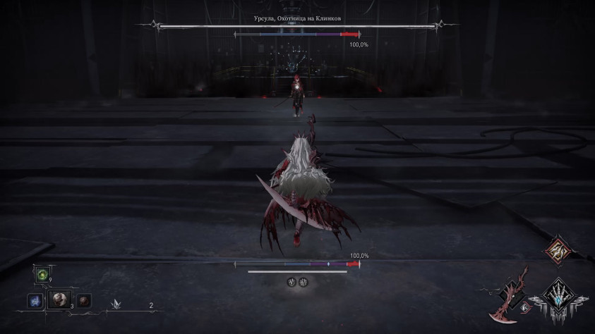 высвободить во врага, что наносит вполне неплохой урон и немного оглушает оппонента. - Баф — ценой определённого количества своего здоровья, Арриса может получить временный баф, при котором все атаки не только наносят дополнительный урон, сопровождающийся особой анимацией, но ещё и накапливают на оппоненте статус «прокол» (аналог «кровотечения» из Dark Souls). Сам баф, хоть и временный, но каждая успешная атака продлевает его продолжительность. Соответственно, если получается находиться всё время в бою, то баф можно поддерживать неограниченное количество времени. Исключительно полезная штука на не особо подвижных врагах, которые не носятся постоянно по арене и дают себя относительно постоянно бить.