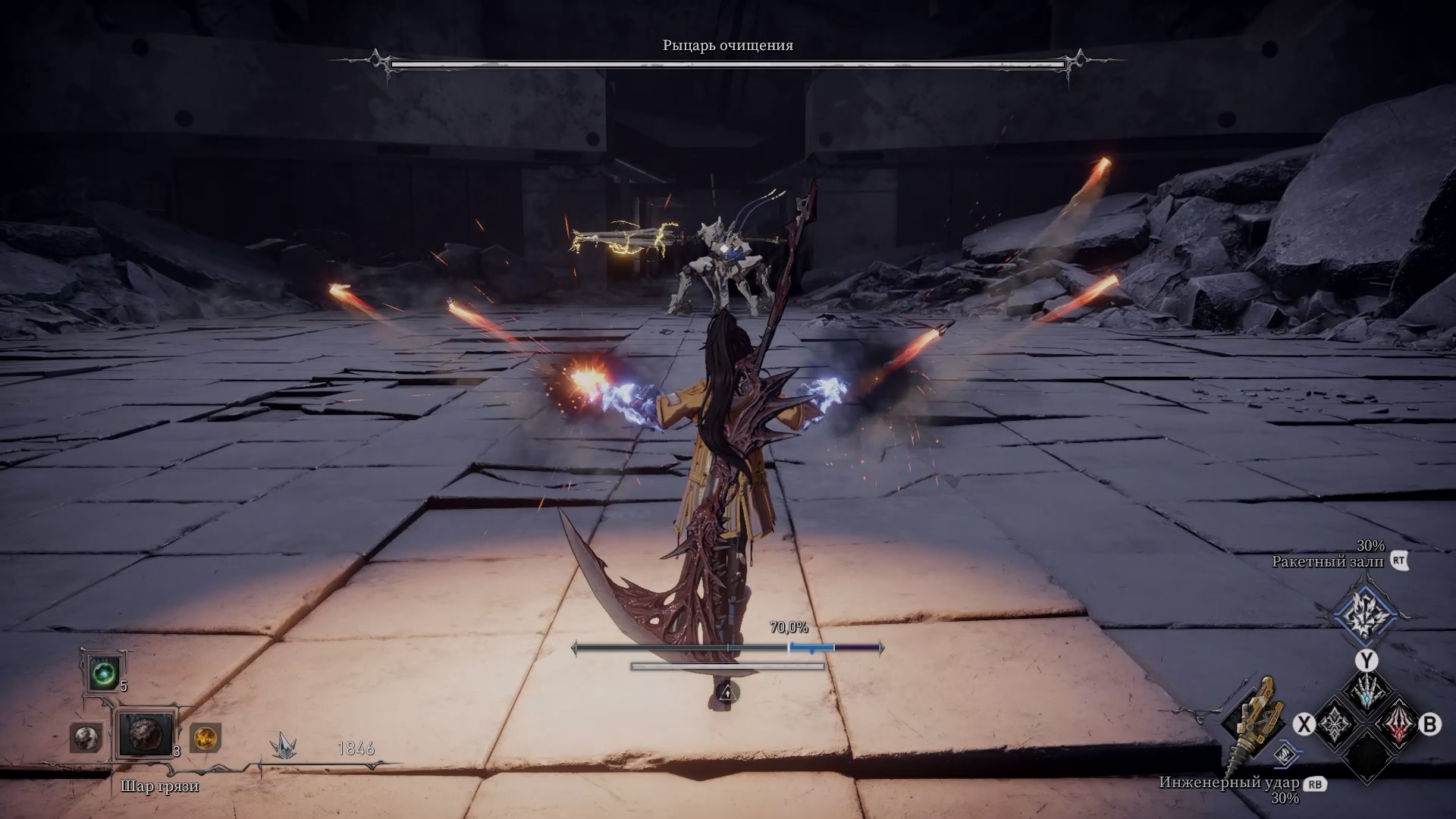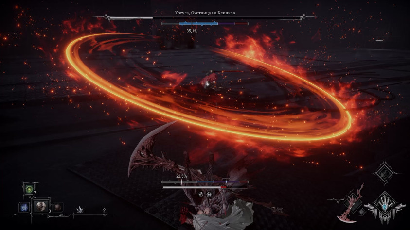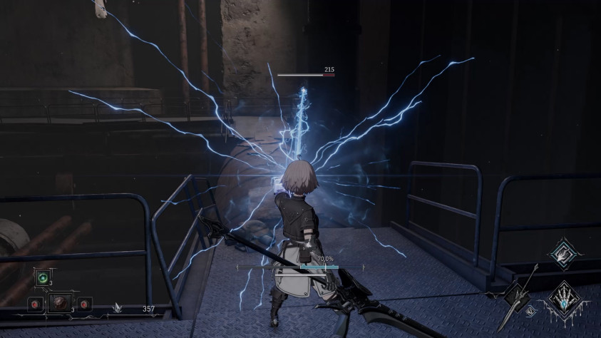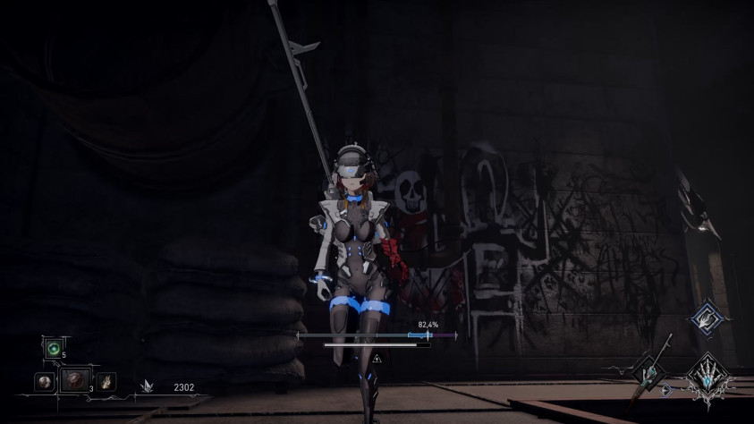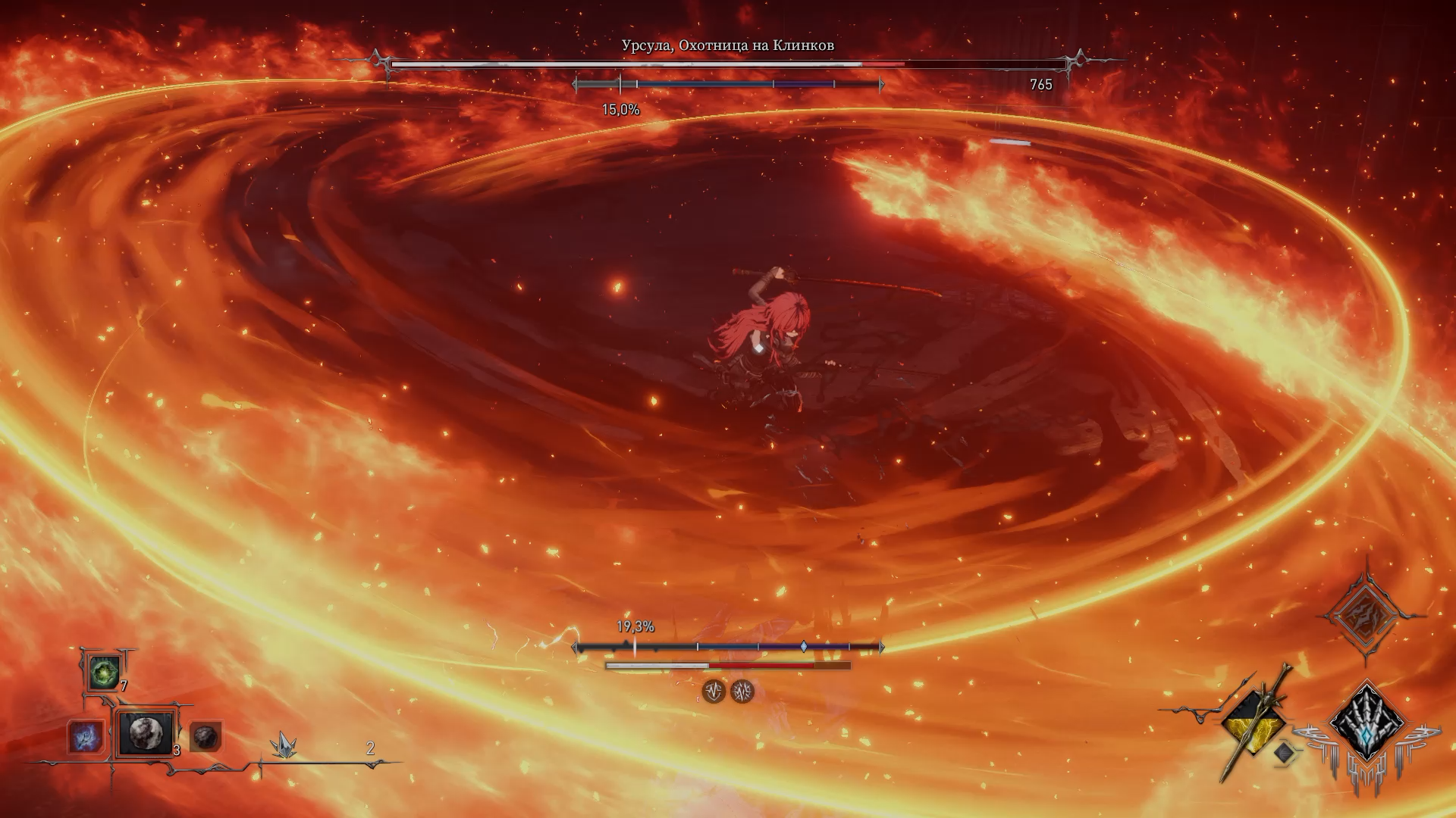 Работает полоска этой «синхронизации» следующим образом. Она разбита на несколько секторов. И чем больше этих секторов заполнены, тем выше урон нашей героини Аррисы. Соответственно, чем меньше у неё заполнена полоска «синхронизации» — тем ниже и урон. За нанесение урона врагам полоска заполняется, а от получения урона — уменьшается. Но кроме того, её можно тратить на уникальные оружейные навыки, на каст заклинаний и на абилки самой Аррисы. По сути, «синхронизация» здесь одновременно является и «концентрацией» и маной.