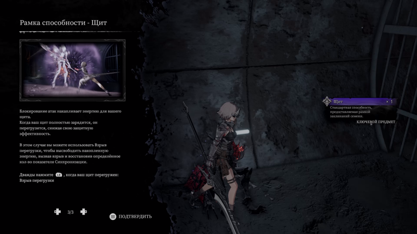 пользовался прям вот много. - Щит — как нетрудно догадаться, используется для блокирования атак. Но если вы думаете, что это всё, то вы ошибаетесь. Блокирование атак, как и получение урона, тратит «синхронизацию», но в значительно меньшей степени. Также, поглощая урон, он накапливает энергию. Накопив её, свечение щита из синего становится фиолетовым. При этом блокирование ухудшается, но зато накопленную энергию можно (и нужно)