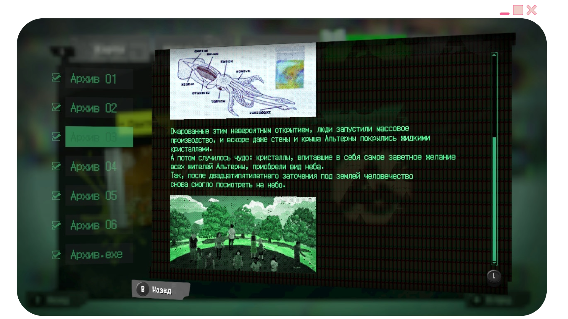 Так началась эра жидких кристаллов. Их стали повсеместно использовать в любых технологических процессах, а также ими обложили стены всего кратера. И вот, одним днём случилось чудо! Жители Альтерны как ни в чём не бывало проснулись, вышли из своих домов и увидели сияние. Не прожекторов, ламп или софитов. То сияло небо над их головами. Оказалось, все жители Альтерны так сильно мечтали вновь увидеть синее небо, что кристаллы впитали в себя всеобщую мечту и воплотили её в реальность.