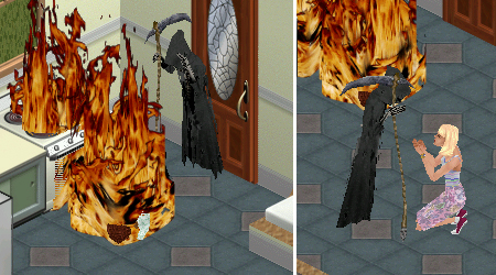 В этом же дополнении появился мрачный жнец — смерть. И теперь Симы умирают не просто превращаясь в могильную плиту, а за ними приходит сама смерть. Конечно же, как и в последующих частях, смерть можно попросить отменить свое решение. И в зависимости от ее желания и настроения Сим может остаться в этом мире, либо же умереть или превратиться в зомби.