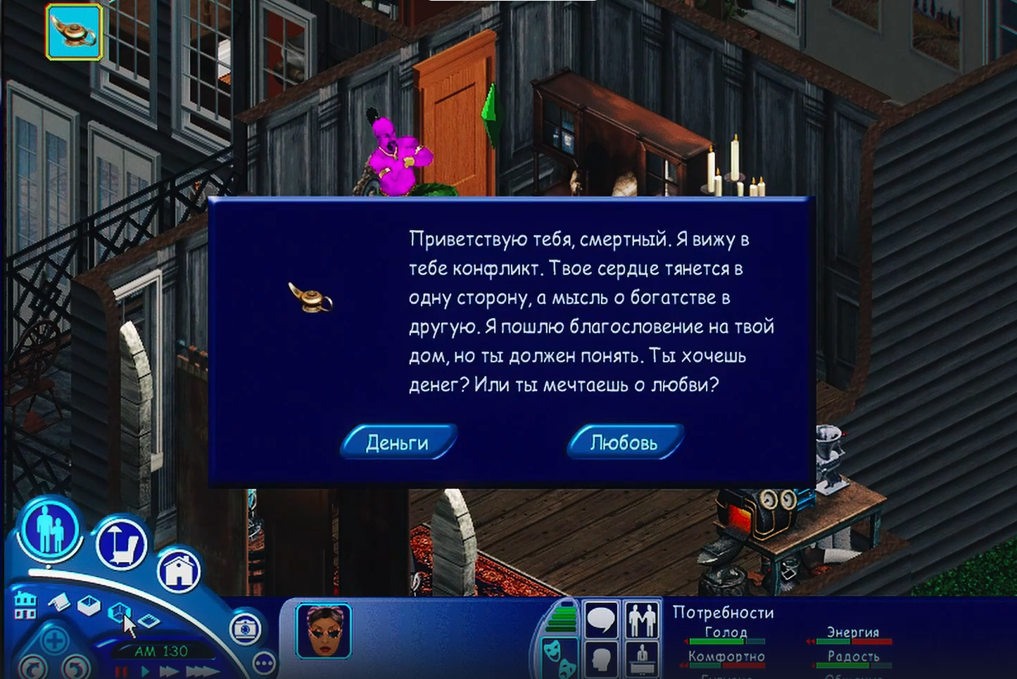 О некоторых новых предметах хочется сказать отдельно. Например, лампа с джином. Каждый раз, когда ваш Сим ее трет, джин предлагает выбрать одно из двух желаний, у которых неоднозначные названия. Но далеко не всегда вы получаете то, что ожидали. С вами происходит либо что-то хорошее, либо что-то плохое. Например, джин может предложить желание из категории «Деньги», и здесь два исхода. Может появиться чан с золотом или множество коммунальных счетов.