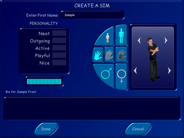 При выборе персонажа менялись только голова и тело (и ещё цвет кожи). Ну и можно было выбрать, за кого ты хочешь играть: ребёнок или взрослый, мужчина или женщина. Еще можно было изменить несколько черт характера, которые в сумме складывались в знак Зодиака.