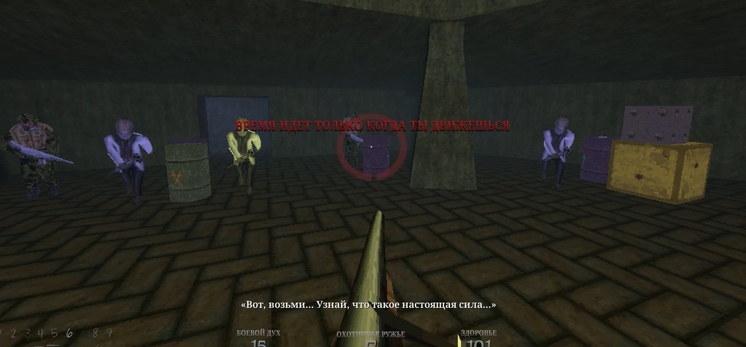 К сожалению, юзать это имеет смысл только ради эстетики, потому что в Superhot мы находимся в режиме пошаговки от первого лица, и замедление времени даёт нам преимущество. В то время как в Dusk - это просто тормоза. Ты делаешь выстрел, и тебе надо ускорить себя, чтобы главный герой повернул дробовик в руке или отстрелил гильзу или перезарядил снайперку. И получается, что в замедлении времени особо и смысла-то нет. Ты просто дерганно двигаешься по арене, матерясь на то, что протагонисту надо после выстрела ещё и дать оттяжку на перезарядку.