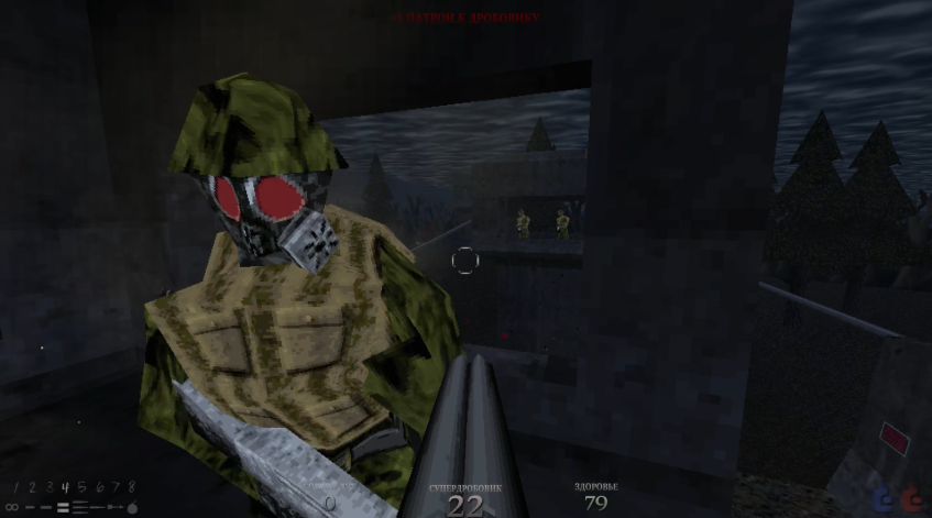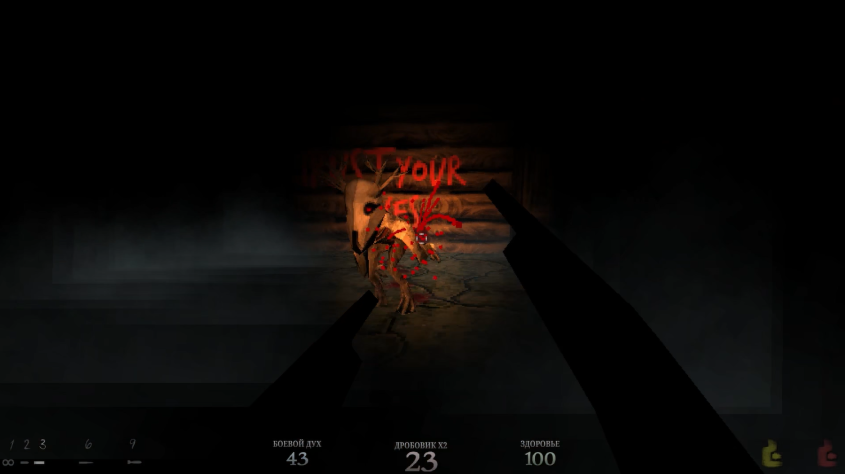Здесь в подвалах базы мы встречаем нового монстра, достойного упоминания, потому что эта скотина будет вас кошмарить до конца игры. Это олень-скелет. Невидимый. Слава богу, он сигнализирует о своем появлении противным звуком и кровавыми следами, и он становится видимым, если в него выстрелить. Но да, эти олени натурально напрягают. Ты внутренне все время чуть-чуть да встревожишься, когда поймёшь, что где-то рядом заспавнилось это чудище.