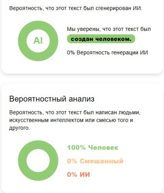 И на добивочку - чтобы показать абсурдность ваших обвинений, я загнал тот же самый текст в другой популярный анализатор (скриншот прикрепляю). Результат: 100% человек. И что мы имеем в сухом остатке? Ваш рандомайзер показал одно, мой — прямо противоположное. Это наглядно доказывает, что цена таким "экспертизам" — ноль. Вы обвиняете меня в "искусственности" на основании генератора случайных чисел, игнорируя содержание. Если текст слишком сложен и структурирован для вас — это не значит, что его писал робот. Это значит, что он просто качественно написан. Но вы можете и дальше биться лбом о стену и доказывать обратное. Удачи.