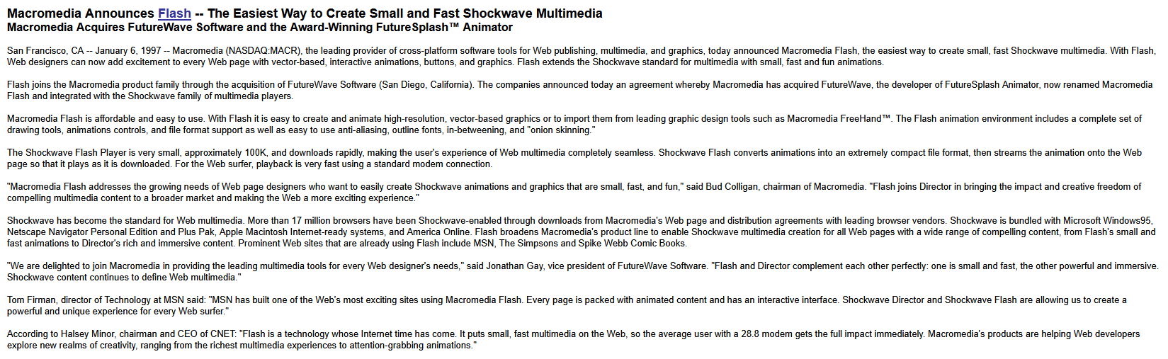 В 1995 году команда Джонатана выпускает 2 приложения. Одно называлось FutureSplach animator, и было в своём роде улучшенной версией SmartSketch, это, так сказать, был их основной продукт - большая утилита которая могла создавать контент в виде swf файлов, не смотря на это, относительно мало людей ею пользовалось. Втором приложением была небольшая программа, которая называлась FutureSplash Player, она была решением проблемы описанной выше. И она уже была у много кого, сейчас такие вещи называют плагинами - дополнениями к браузеру которые как-то расширяют его функциональность, этот плеер не был первым плагином, но он стал одним из самых популярных.