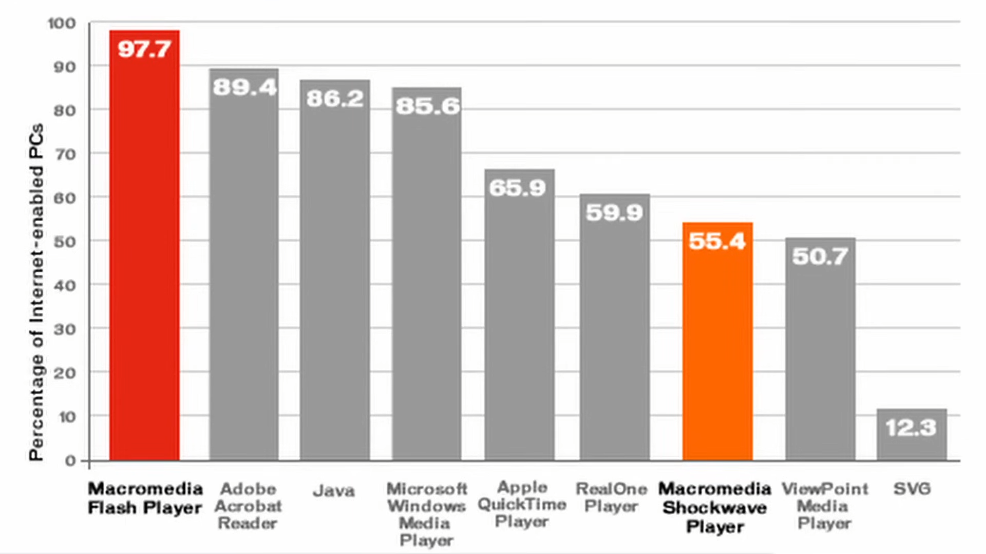 Этот небольшой плагин произвёл настоящее чудо и очень быстро именно это стало основной сутью продукта FutureSplash, затмив какие-либо возможности как приложения по работе с графикой. Но FutureSplash не был первым подобным приложением, среди самых важных конкурентов нужно выделить компанию Macromedia со своим Macromedia ShockWave, который в плане воспроизведения анимации был даже лучше. Однако у FutureSpalsh было одно достоинство, которое позволило именно ему стать самым популярным средством просмотра контента в браузере - размеры swf файлов.