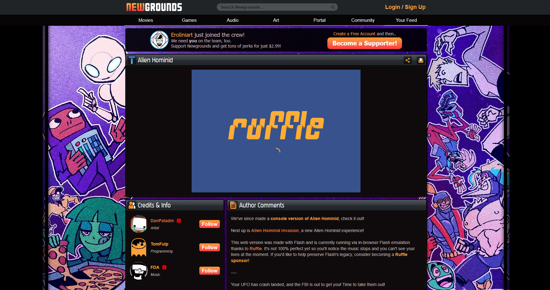 Запуская его быстро становится очевидно, что флеш игра это в первую очередь не то на чём игра сделана, это как раз не так уж и важно, хоть на ассемблере. Важен факт того, что она запускается в браузере, что она висит на сайте с кучей других игр, что в комментариях есть люди которые общаются с разработчиком и сам разработчик, и конечно важен фактор того, что это всё было очень давно и люди просто скучают по своей молодости. И это сохранить Flashpoint не может, несмотря на внушительную базу игр засиживаться в нём есть желание только если вы ищете что-то конкретное, но я не думаю что вы проведёте в нём больше чем полчаса, всё-таки флеш игры устарели и открывая случайную игру вы вряд ли найдёте что-то крутое. Тем не менее другие умельцы решили что нужно сохранить флеш игры именно в браузерном виде, поэтому сделали специальный эмулятор, который съесть все swf файлы и внутри себя преобразует их как делал это флеш плеер. Программулина эта имеет название Ruffle, именно она позволила мне в этом блоге давать ссылки на упоминаемые флеш игры, её используют такие сайты как Newgrounds дабы люди могли продолжать запускать браузерки именно в том виде, в котором они делали это 10+ лет назад. На мой взгляд это гораздо более правильная резервация, учитывая что его даже скачивать не нужно.