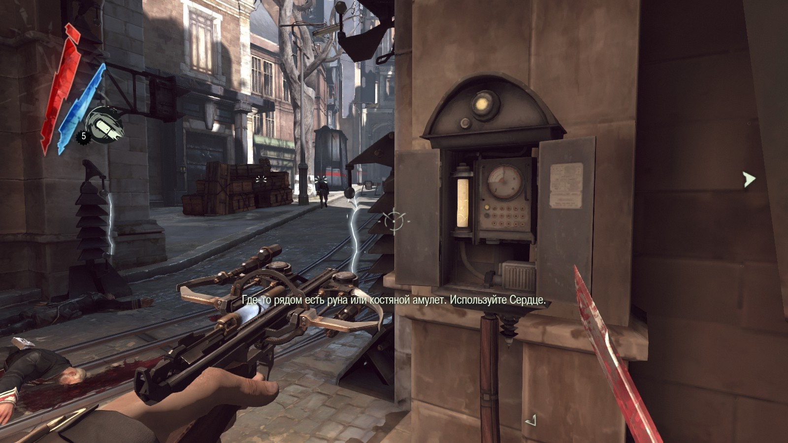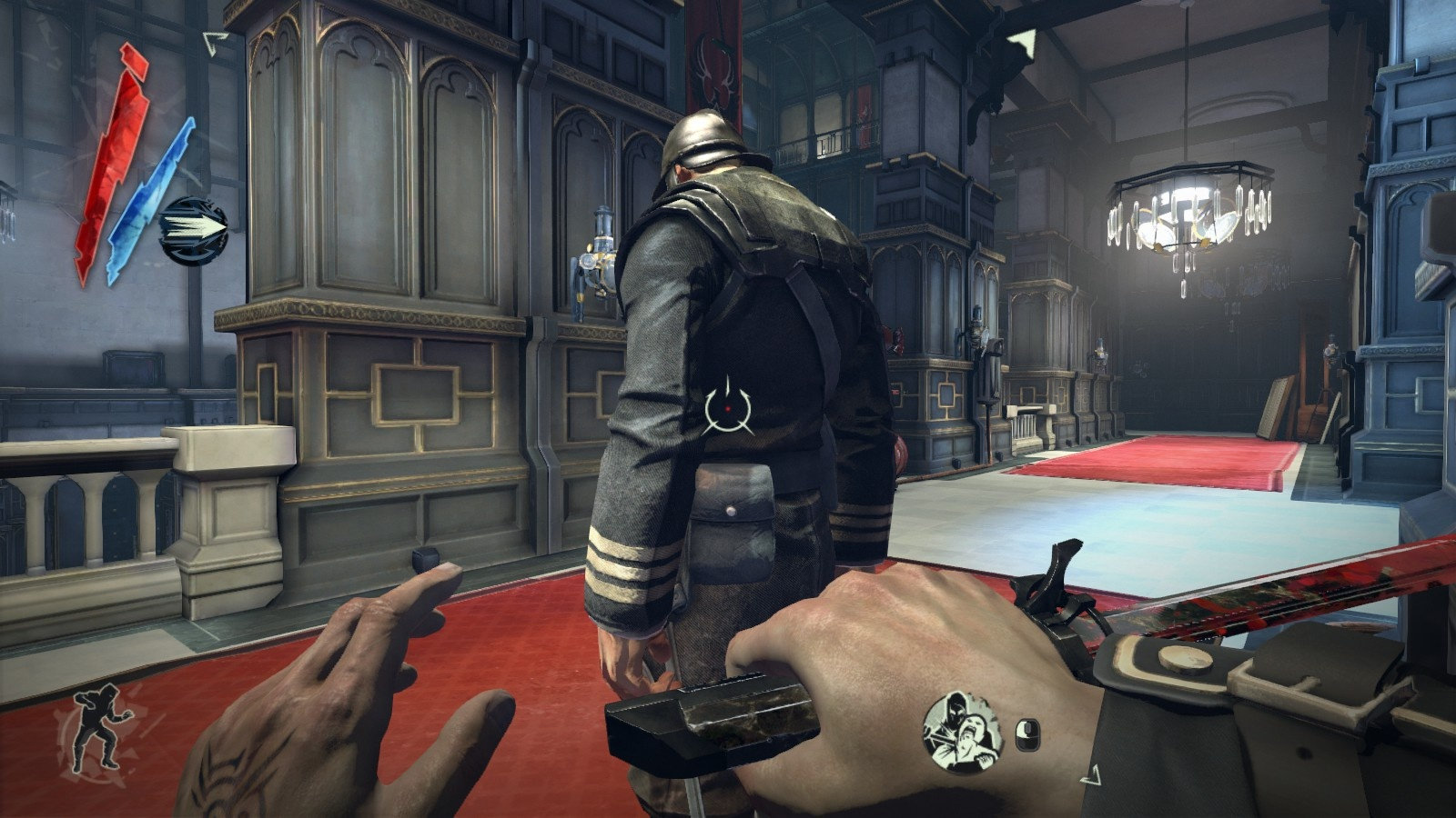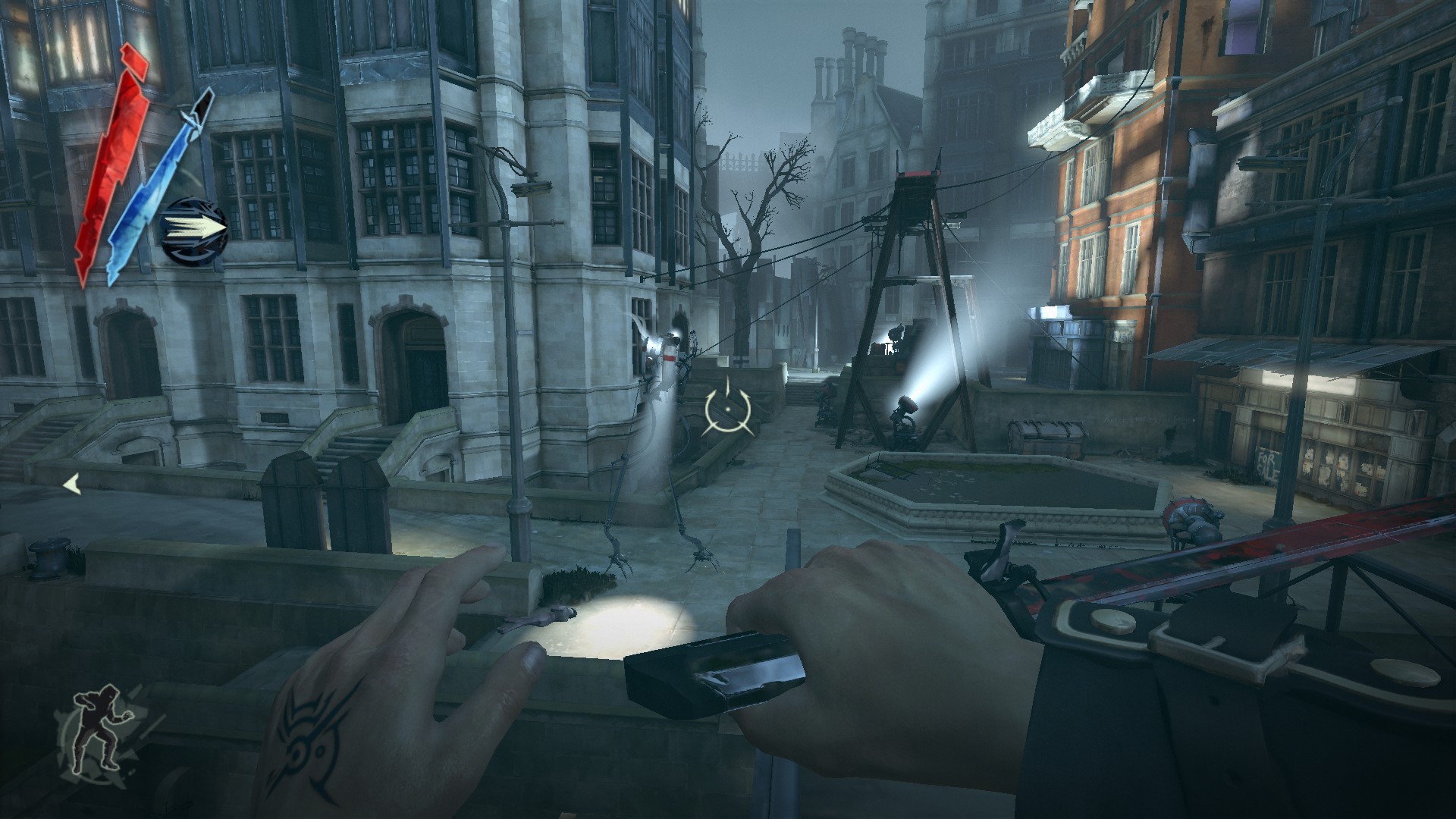 Очень сильно меня раздражал искусственный интеллект местных болванчиков и скрипты. В Dishonored AI работает очень странно. Противники порой не способны увидеть в упор главного героя, то засекают Корво, находящегося в укрытии, с другого конца локации, о чём сразу узнают все охранники на уровне. Как пример, я на второй миссии пробирался по-тихому к местности, которую патрулировала стража. Поднимаясь, я заметил, как ко мне приближается стражник, но он меня не замечает вообще, однако его сослуживец, находясь в другом углу, мгновенно палит меня, и через секунду вся стража знает, что здесь находится бывший телохранитель императрицы. Или ещё пример: в башне Дануолла я незаметно нейтрализовал часть персонала и поднялся на самый верх за руной. Оставаясь незамеченным, спустился вниз — а там о моём присутствии знает каждая собака, хотя тревогу никто не поднимал. Видимо у всех стражников ещё тогда была телепатическая связь или беспроводные гарнитуры, через которые они общаются между собой. И это только малая часть подобных примеров. К тому же местные болванчики обладают очень узким полем зрения, не способны посмотреть наверх и порой не видят главного героя, стоящего на расстоянии вытянутой руки в полный рост.