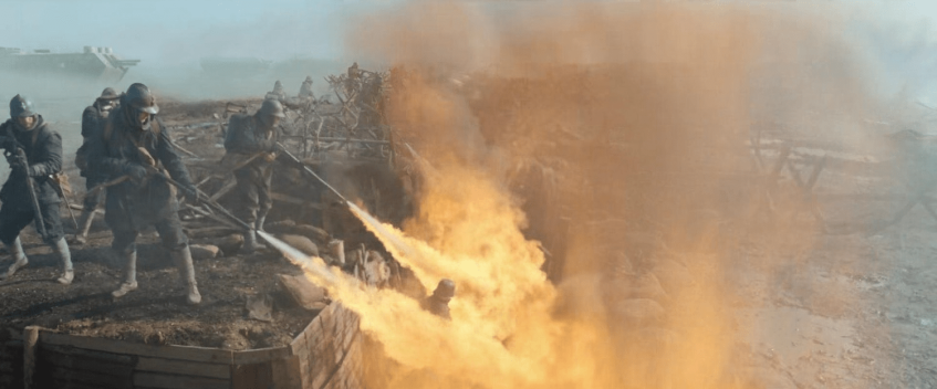 Ритм фильма очень разрозненный и не складывается в работающую систему. Вот первый бой (без вопросов, шикарный), вот герои идут на фронт, вот уже бомбежка, вот чистят картошку, находят умерших от газа, а тут находят афишу с актрисой. Все это слишком мелко нарезано и редко успевает сработать в полной мере. Зритель почти никогда не успевает погрузиться в полной мере ни в мучительный ужас войны, ни в тепло и спокойствие мирных сцен.
